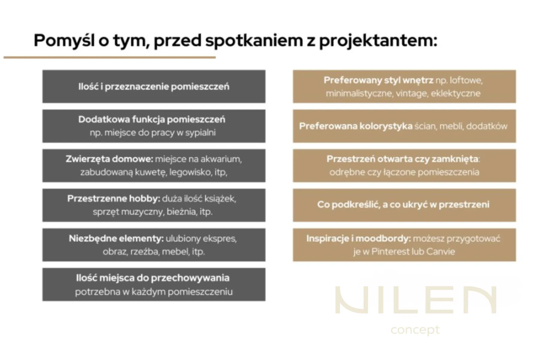 Jeszcze przed spotkaniem z projektantem, zastanów się, jaki styl wnętrz Ci się podoba i w jakich wnętrzach czujesz się dobrze. Nie kieruj się modą! Oczywiście, warto czerpać inspiracje z trendów, ale prawdopodobnie nie będziesz robił remontu z każdym sezonem. Jeżeli masz swój ulubiony styl, podążaj za nim. Lubisz często przearanżować przestrzeń? Postaw na neutralne kolory i stałą zabudowę, do której będą pasowały różne dekoracje.