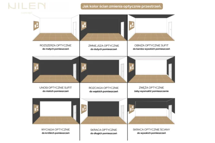 Ciekawym trickiem jest również wykorzystanie kolorów do optycznej manipulacji przestrzenią. Malując ściany różnymi kolorami możemy zwiększyć, poszerzyć lub wydłużyć pomieszczenie a nawet wizualnie podnieść sufit. Wystarczy umiejętnie dobrać kolory do odpowiednich ścian według zasad na poniższej grafice.