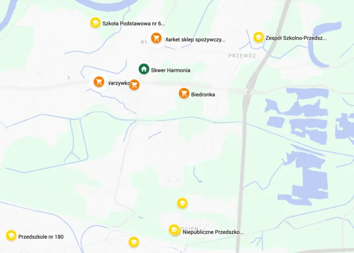 W promieniu kilku km od inwestycji Skwer Harmonia znajdują się placówki edukacyjne. Głównie są to: trzy szkoły podstawowe (w odległościach 1,9 km -2,7 km), kilka przedszkoli (w odległości 1,9 – 2,6 km) oraz cztery żłobki (w odległości 1,9 do 3 km). Większość z nich jest ulokowanych po drugiej stronie ulicy Christo Botewa co w praktyce oznacza konieczność dojazdu – najczęściej samochodem.