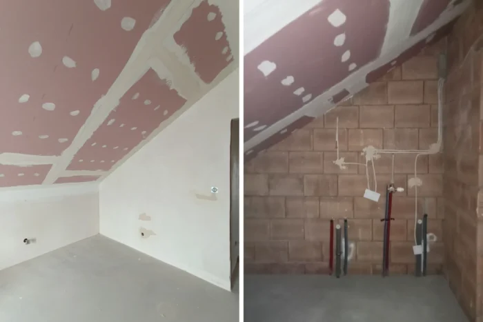 • Skosy dachowe na piętrze wykończone płytami gipsowo-kartonowymi zostały jedynie wstępnie zaciągnięte szpachlą na łączeniach i miejscach wkrętów. Cała powierzchnia płyt była nie szpachlowana i nieprzygotowana do dalszych prac. Konieczne było: szpachlowanie całopowierzchniowe, które wyrównuje chłonność podłoża, zapewnia lepszą przyczepność farby i jednolity wygląd ściany, bez tego, łączenia płyt i miejsca po wkrętach mogą być widoczne po nałożeniu farby. Szlifowanie oraz gruntowanie ścian przed malowaniem.