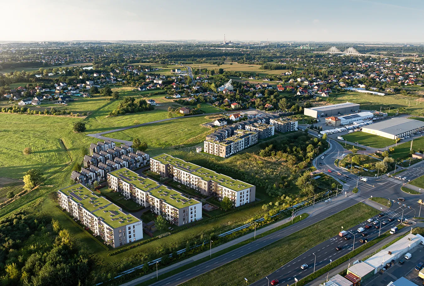 Skwer Harmonia powstaje w południowo-wschodniej części Krakowa, na styku dzielnic Podgórze i Bieżanów-Prokocim. To lokalizacja, która może łączyć dwa pozornie sprzeczne światy – spokój i bliskość przyrody z wygodnym dostępem do kluczowych arterii komunikacyjnych miasta. Bezpośrednie sąsiedztwo inwestycji to głównie zabudowa jednorodzinna, niezabudowane tereny zielone oraz lokale produkcyjne. Osiedle zlokalizowane jest przy jednej z głównych dróg przelotowych – ulicy Półłanki, która łączy się z ruchliwą, prowadzącą zarówno do centrum jak i wjazd na S7 i autostradę A4 – ul.Christo Botewa.