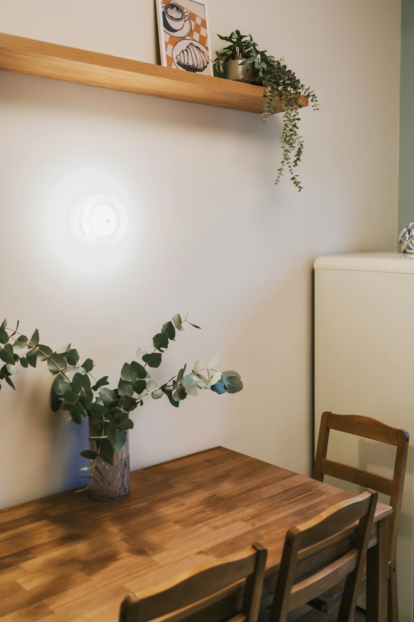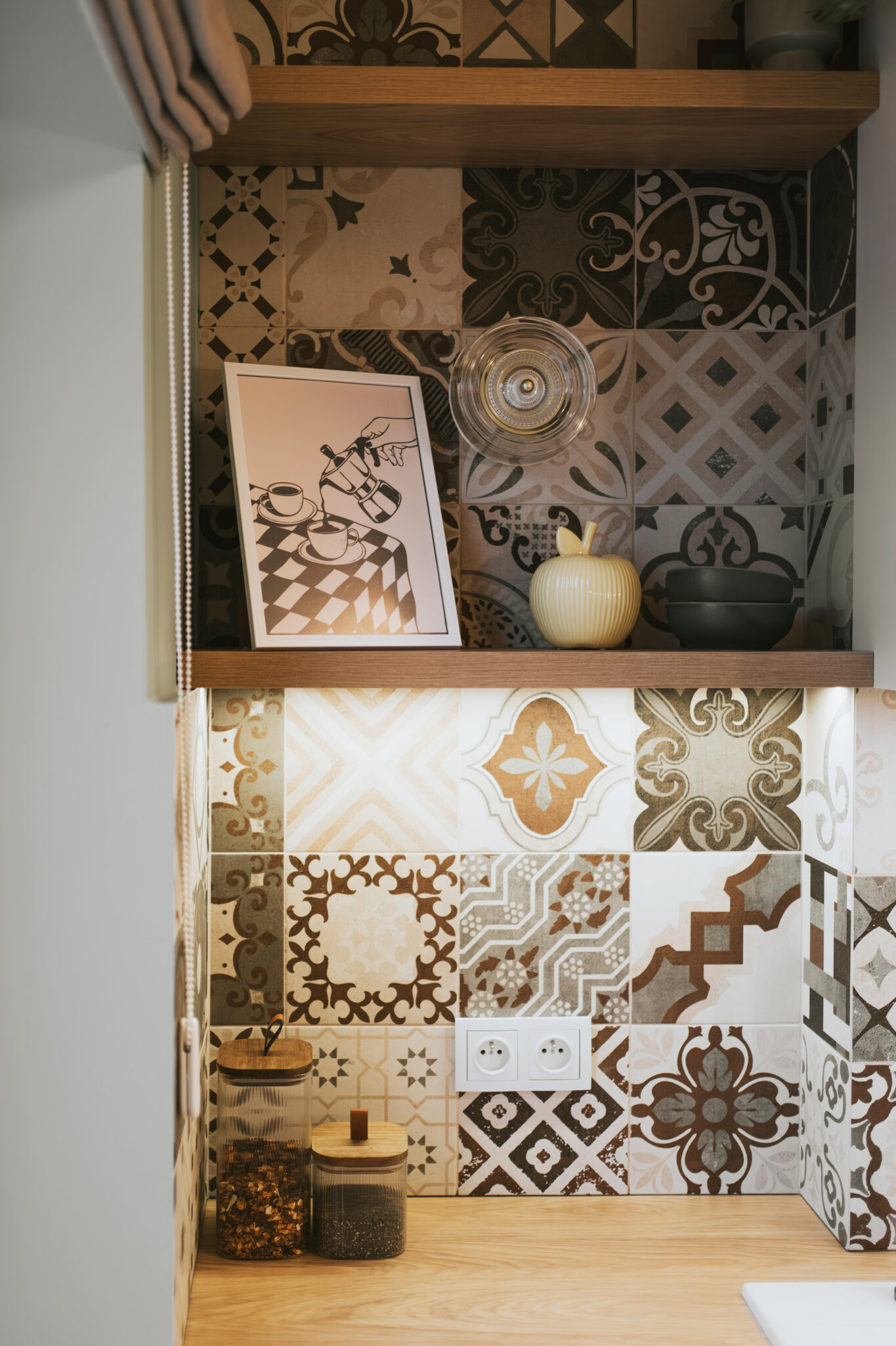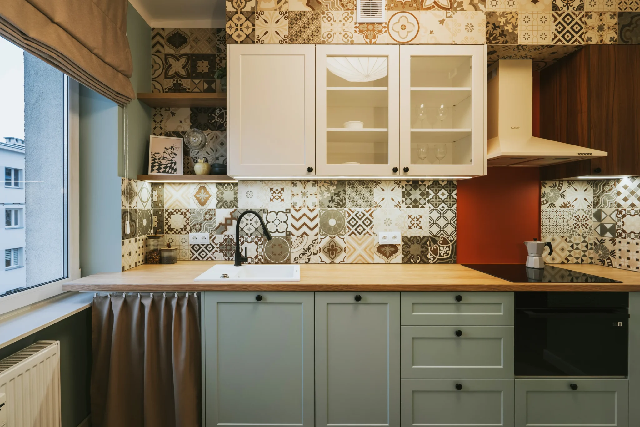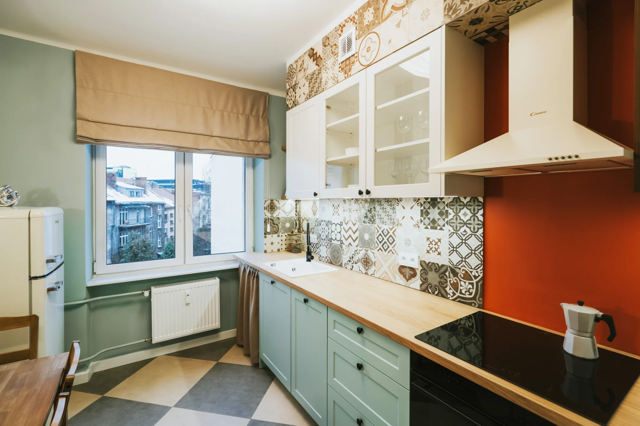 Kuchnia nawiązuje do przytulnych, południowoeuropejskich wnętrz. Jasnozielone fronty, drewnopodobny blat, płytki o delikatnym wzorze i retro lodówka tworzą atmosferę ciepła i domowej swobody. Zamiast zmieniać układ, skupiliśmy się na maksymalnym wykorzystaniu dostępnej przestrzeni: wysokiej zabudowie, funkcjonalnej strefie do gotowania i wygodnym stole, który pełni rolę miejsca spotkań. Uwzględniono także możliwość ukrycia pralki w kuchni za zasłonką rozwiązanie często spotykane w mieszkaniach w kamienicach, szczególnie tych adaptowanych jako praktyczne mieszkanie dla studenta.