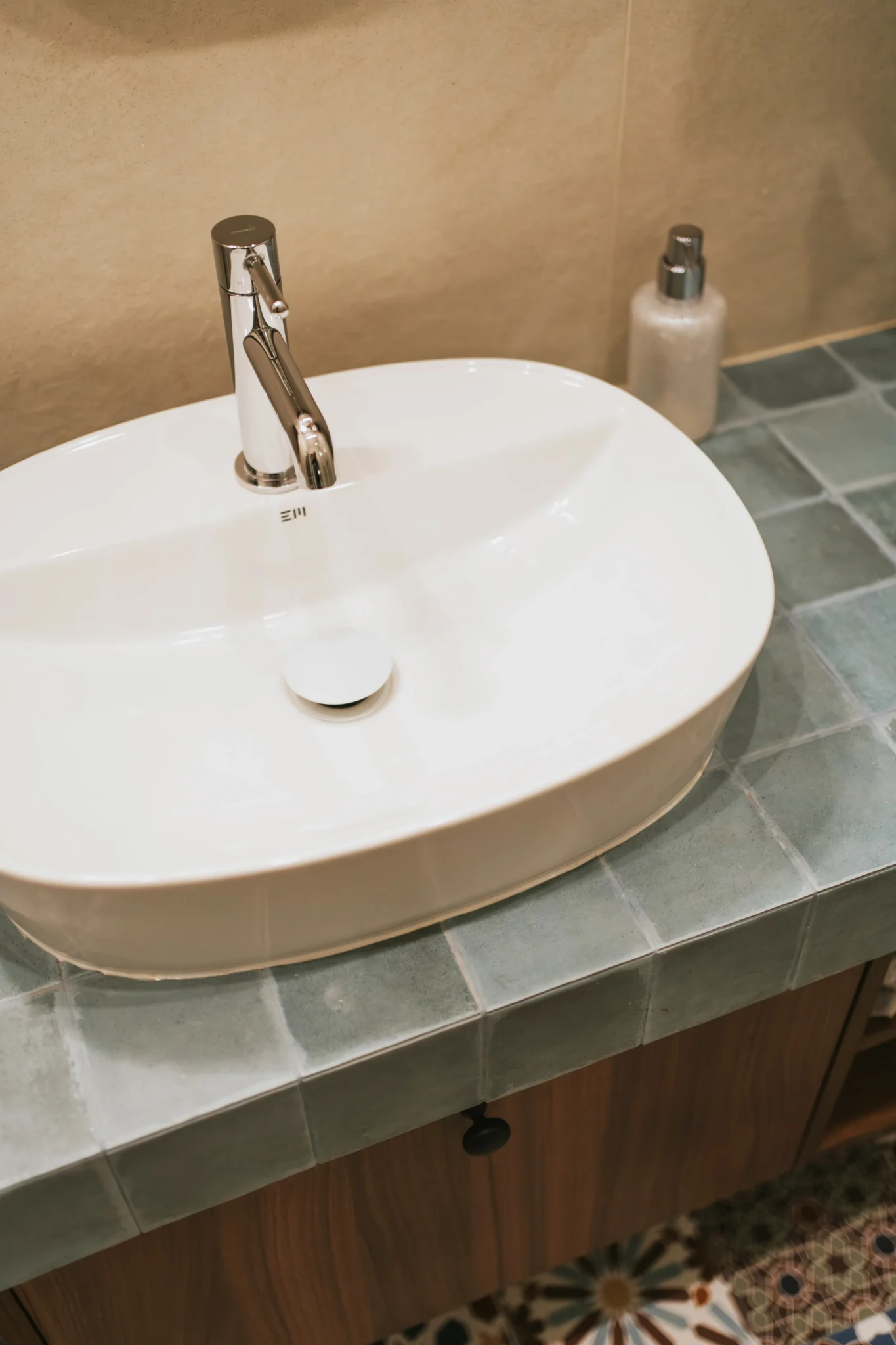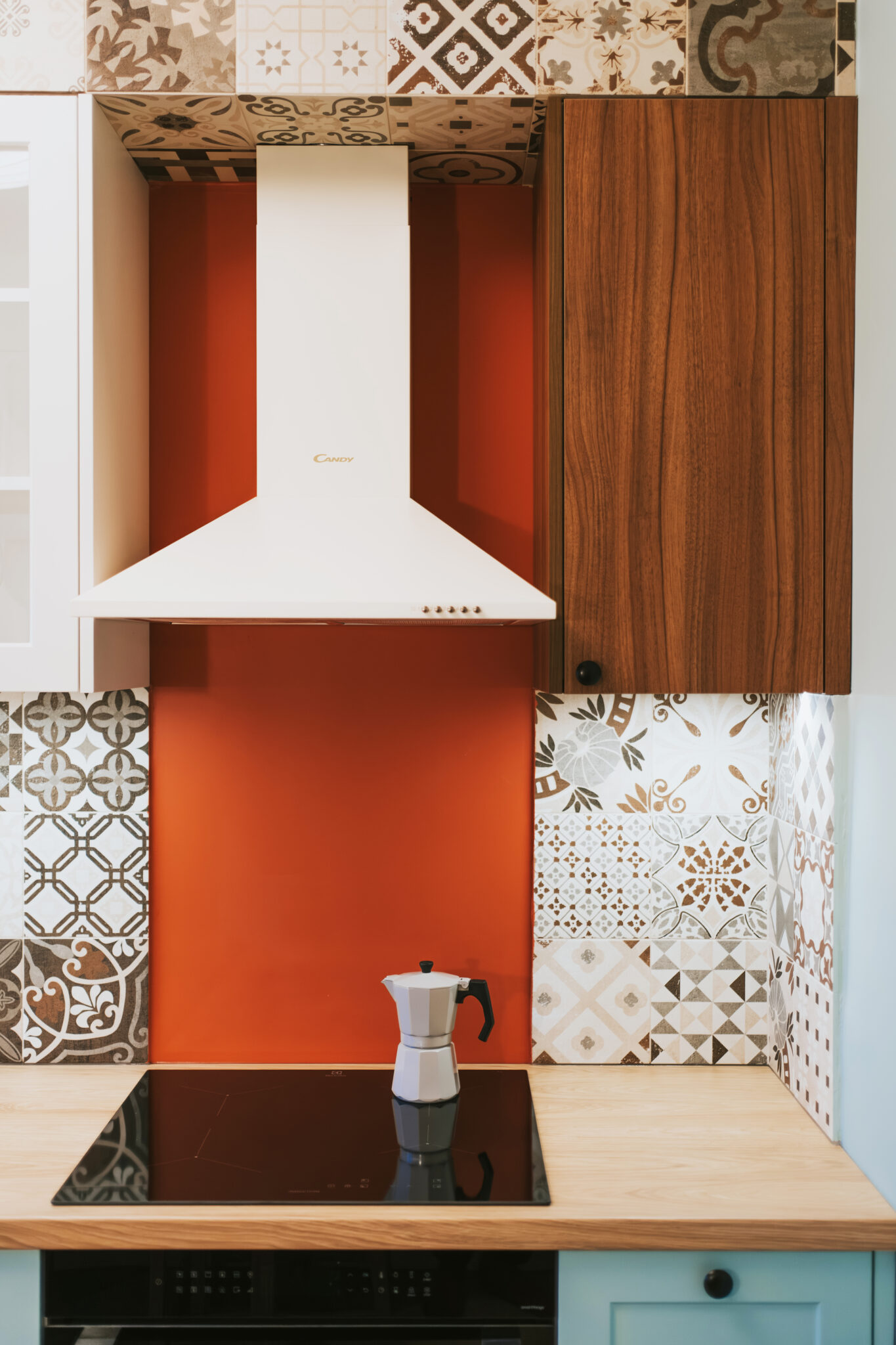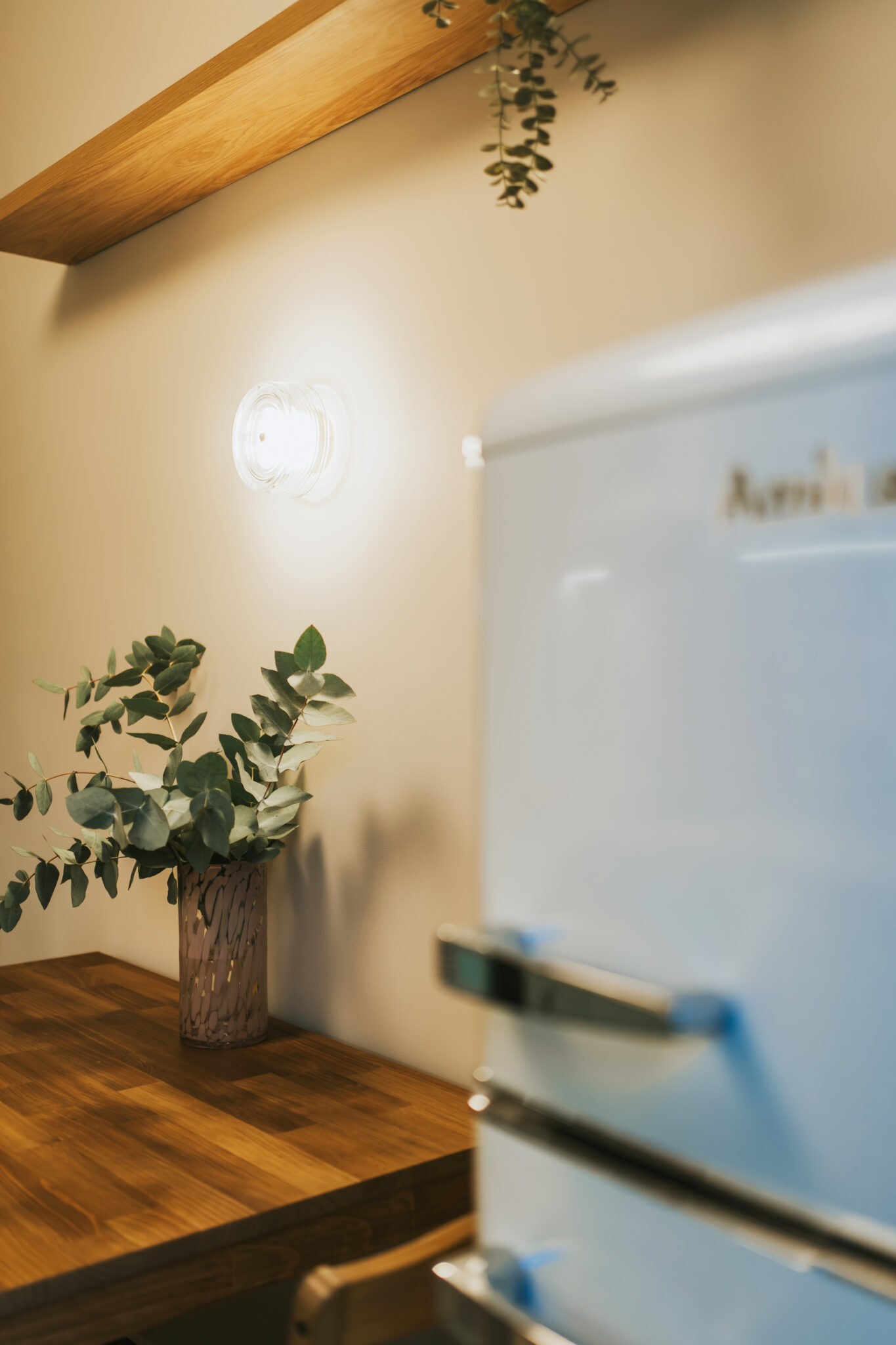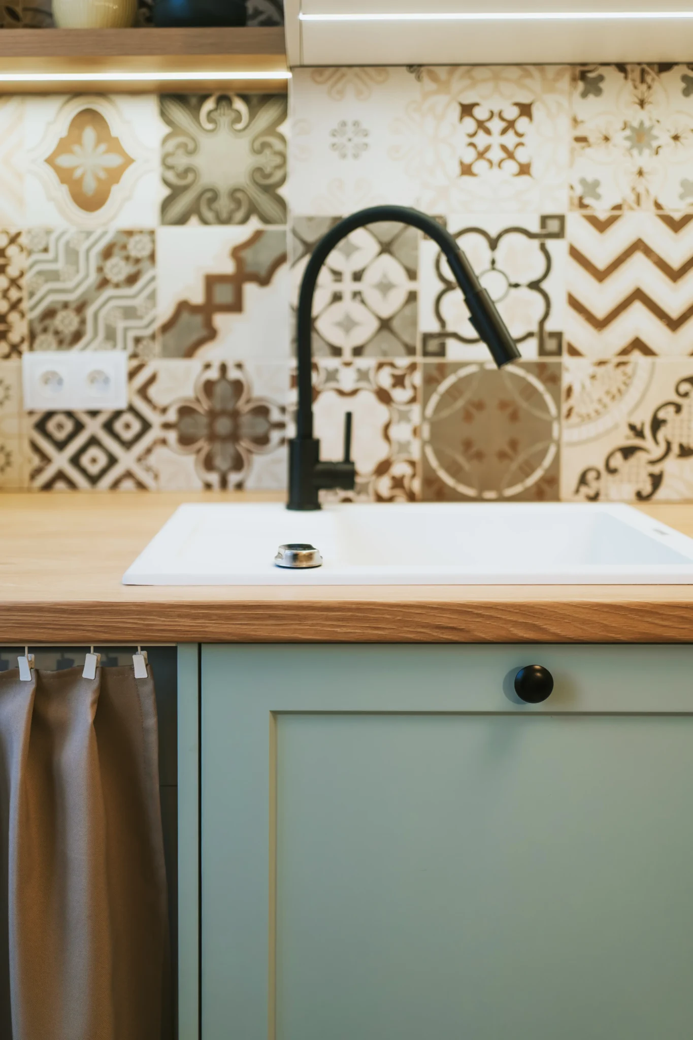 Kuchnia nawiązuje do przytulnych, południowoeuropejskich wnętrz. Jasnozielone fronty, drewnopodobny blat, płytki o delikatnym wzorze i retro lodówka tworzą atmosferę ciepła i domowej swobody. Zamiast zmieniać układ, skupiliśmy się na maksymalnym wykorzystaniu dostępnej przestrzeni: wysokiej zabudowie, funkcjonalnej strefie do gotowania i wygodnym stole, który pełni rolę miejsca spotkań. Uwzględniono także możliwość ukrycia pralki w kuchni za zasłonką rozwiązanie często spotykane w mieszkaniach w kamienicach, szczególnie tych adaptowanych jako praktyczne mieszkanie dla studenta.