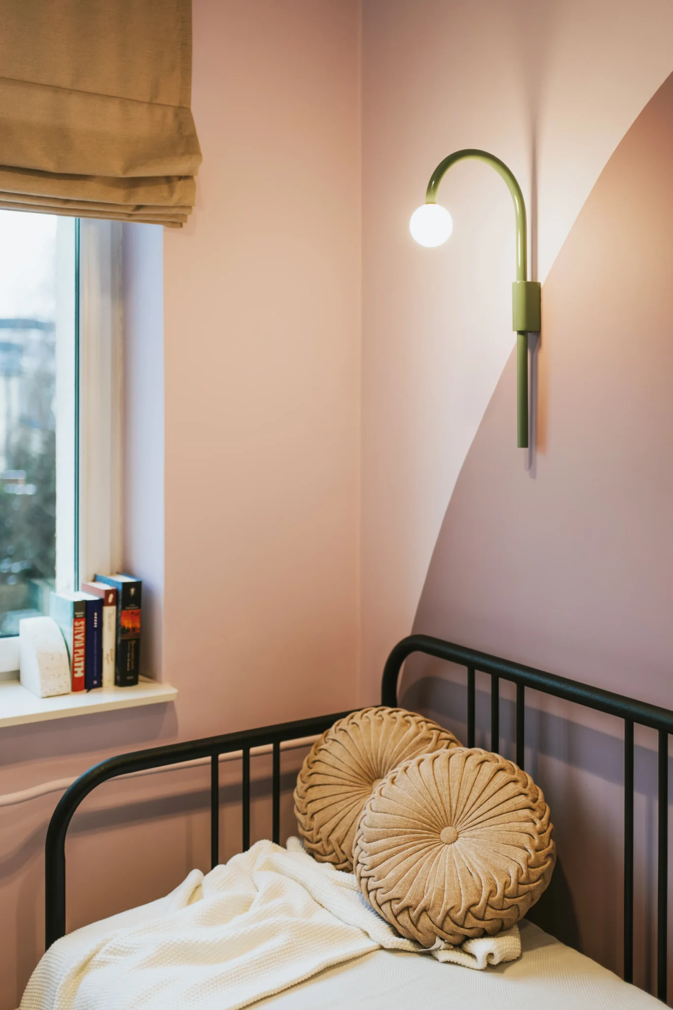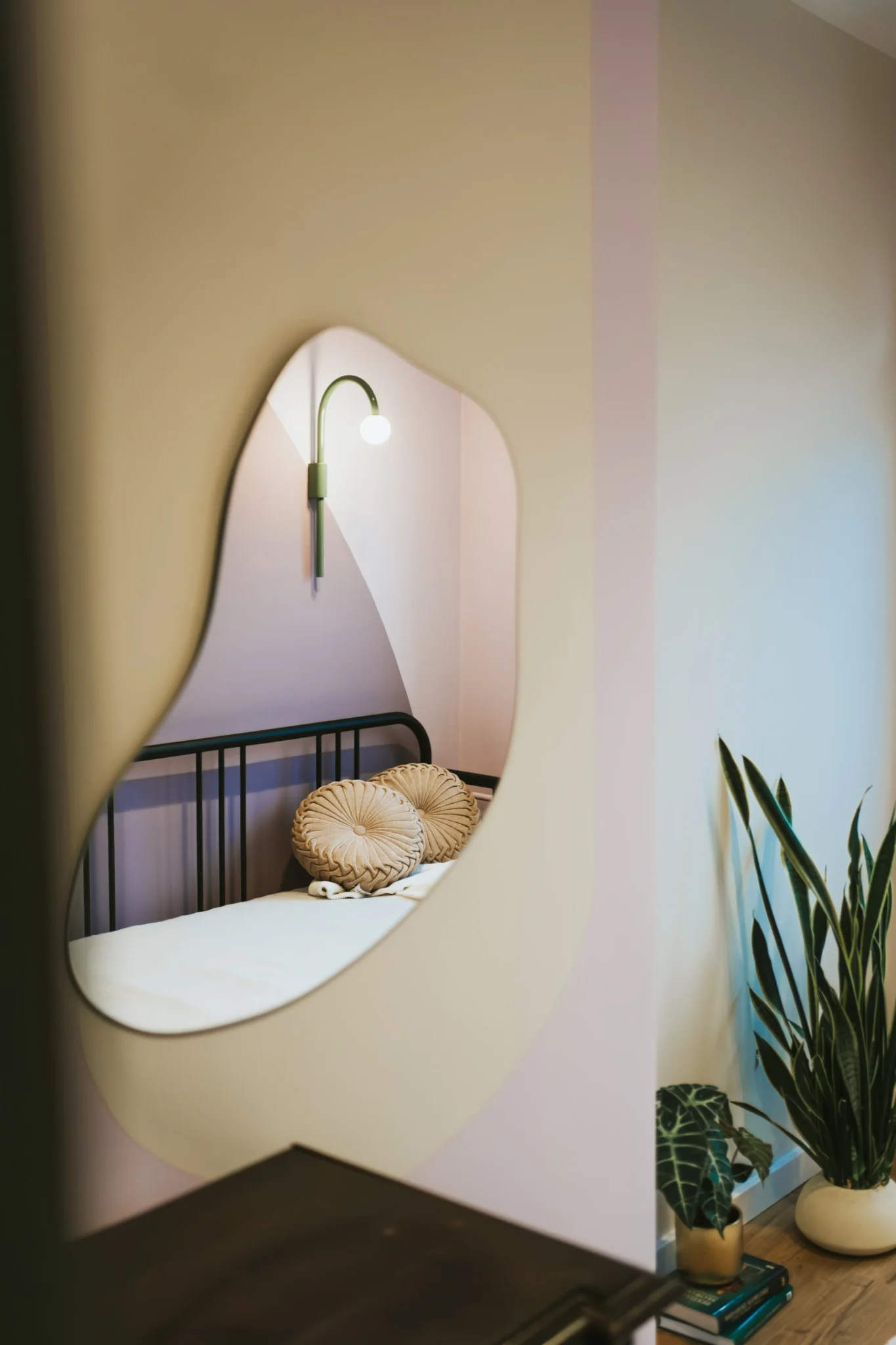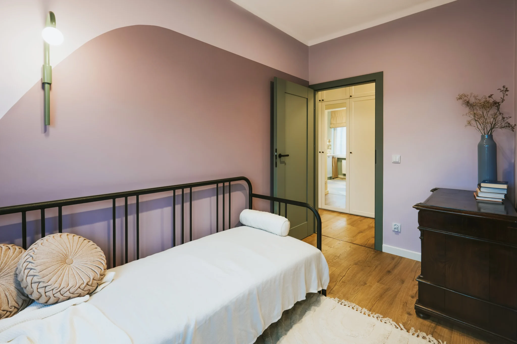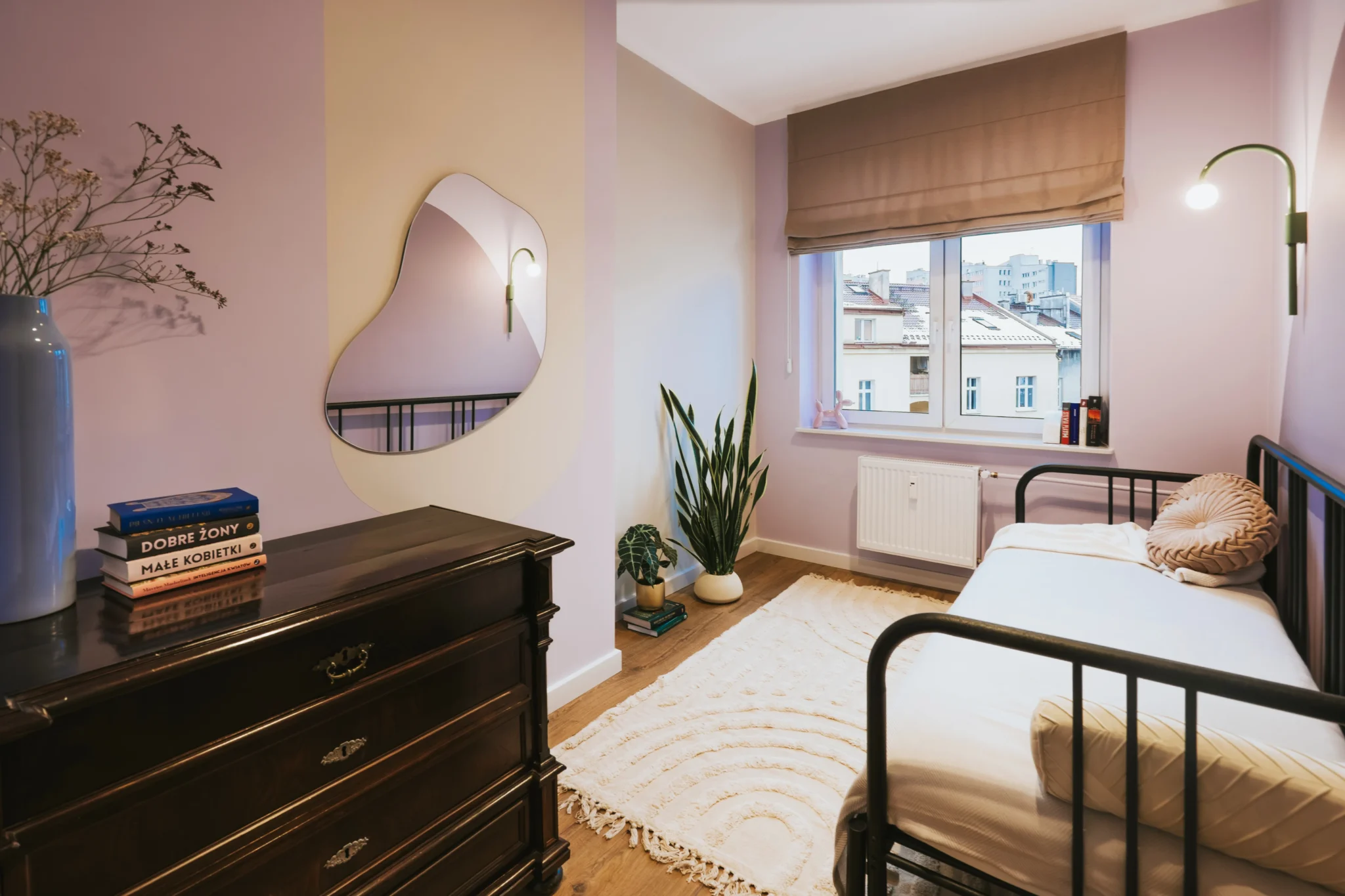 Sypialnia to spokojna, zmysłowa przestrzeń w odcieniach lawendy i fioletów. Wykorzystaliśmy istniejącą wnękę, tworząc półki na książki, a rozkładane łóżko i brak telewizora wzmacniają atmosferę wyciszenia i odpoczynku ważną w intensywnym życiu studentki. To wnętrze, choć niewielkie, idealnie odpowiada temu, jak powinna wyglądać prywatna strefa w mieszkaniu dla studenta.