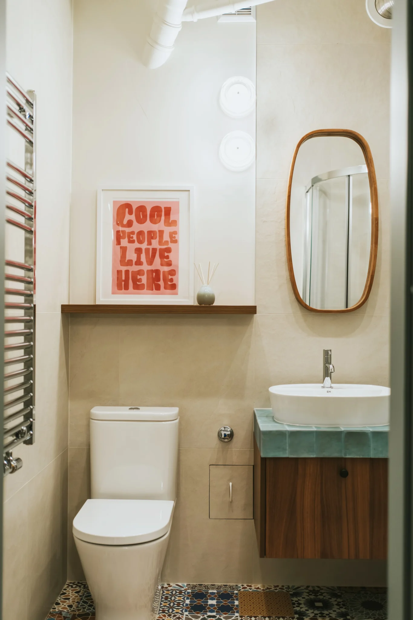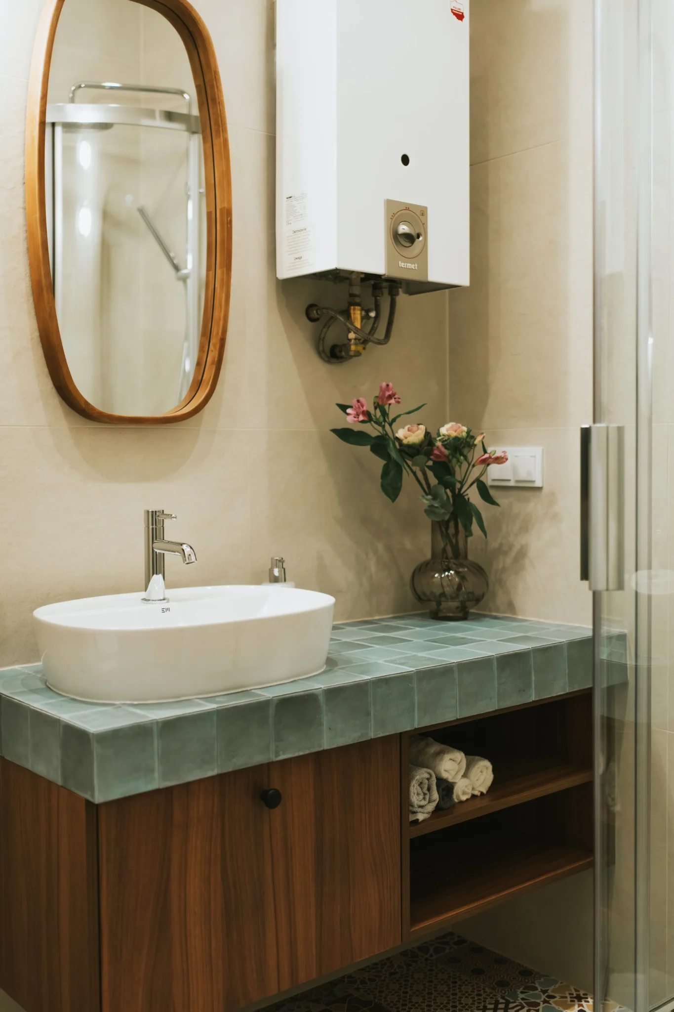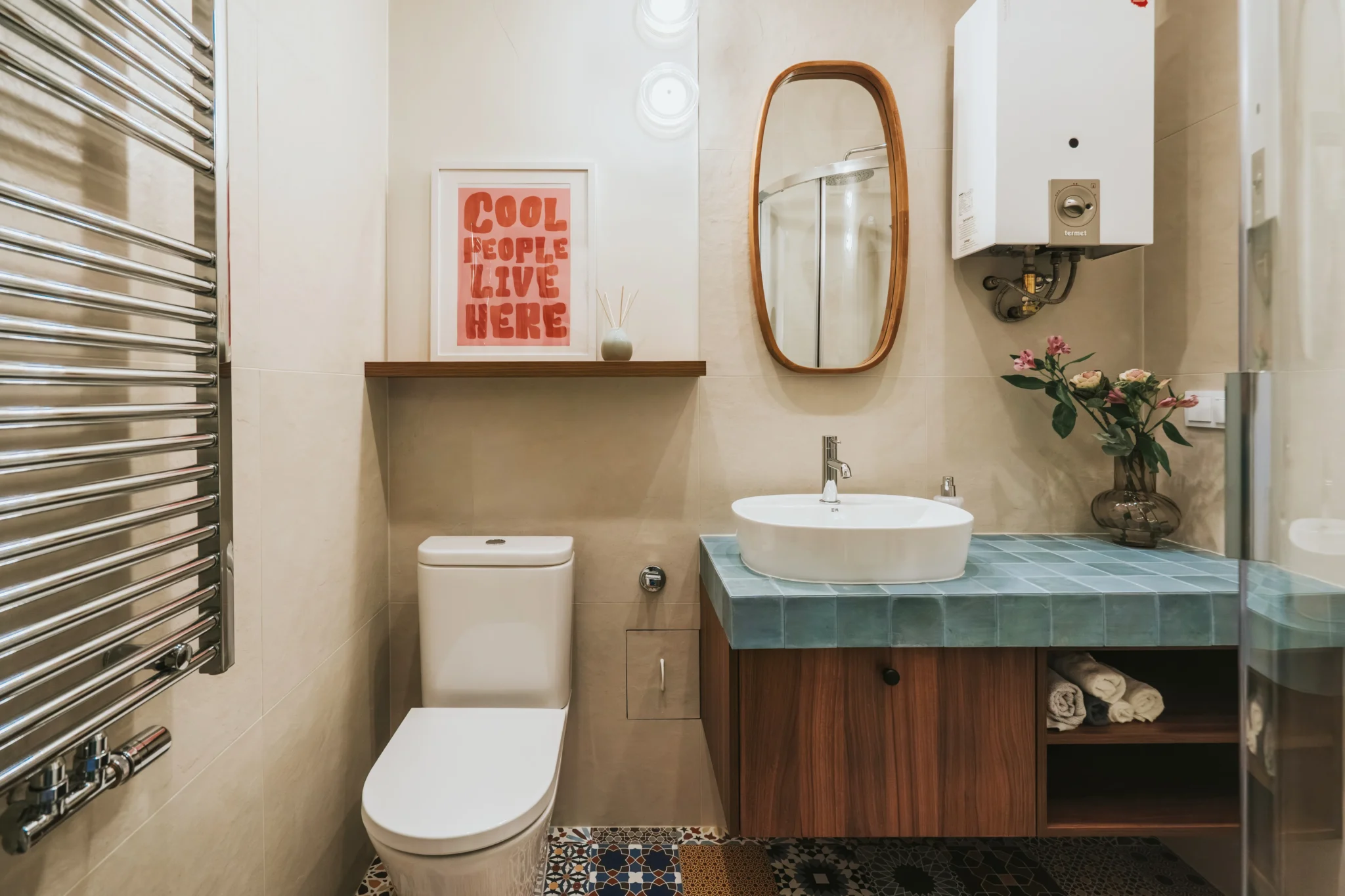 Łazienka, mimo niewielkiego metrażu, zyskała świeży i uporządkowany wygląd dzięki jasnym płytkom po sufit, chromowanej armaturze i funkcjonalnej kabinie prysznicowej. Zamurowanie dawnego okienka do kuchni pozwoliło lepiej zdefiniować przestrzeń i nadać jej większej prywatności, pozostając w pełnej harmonii z resztą mieszkania.