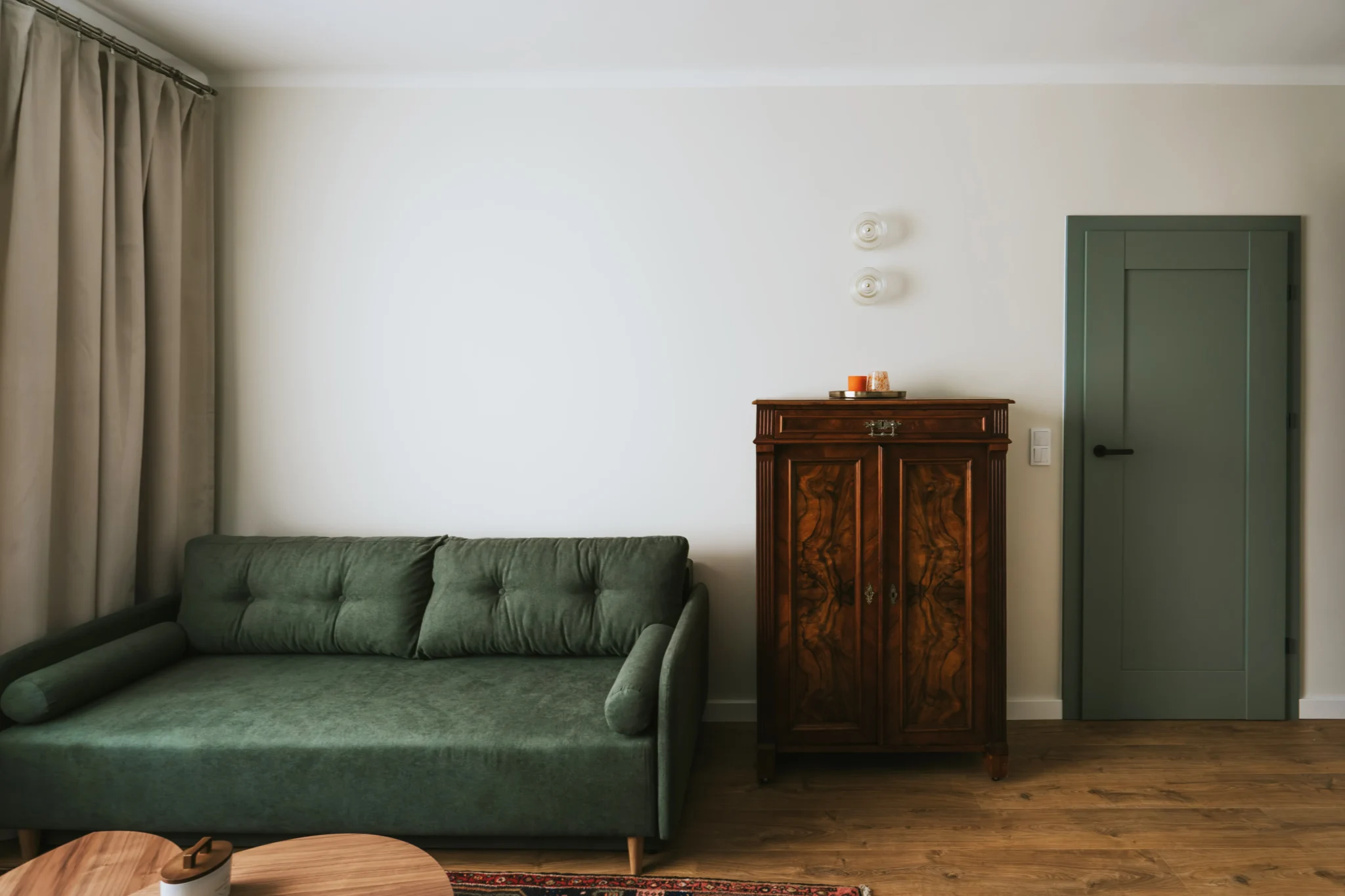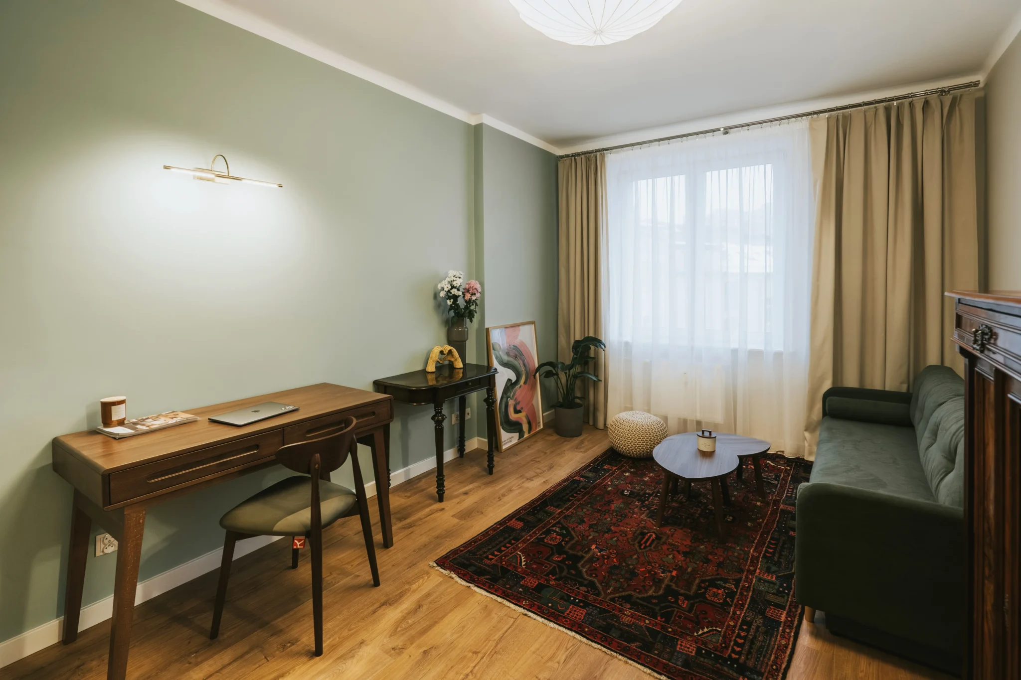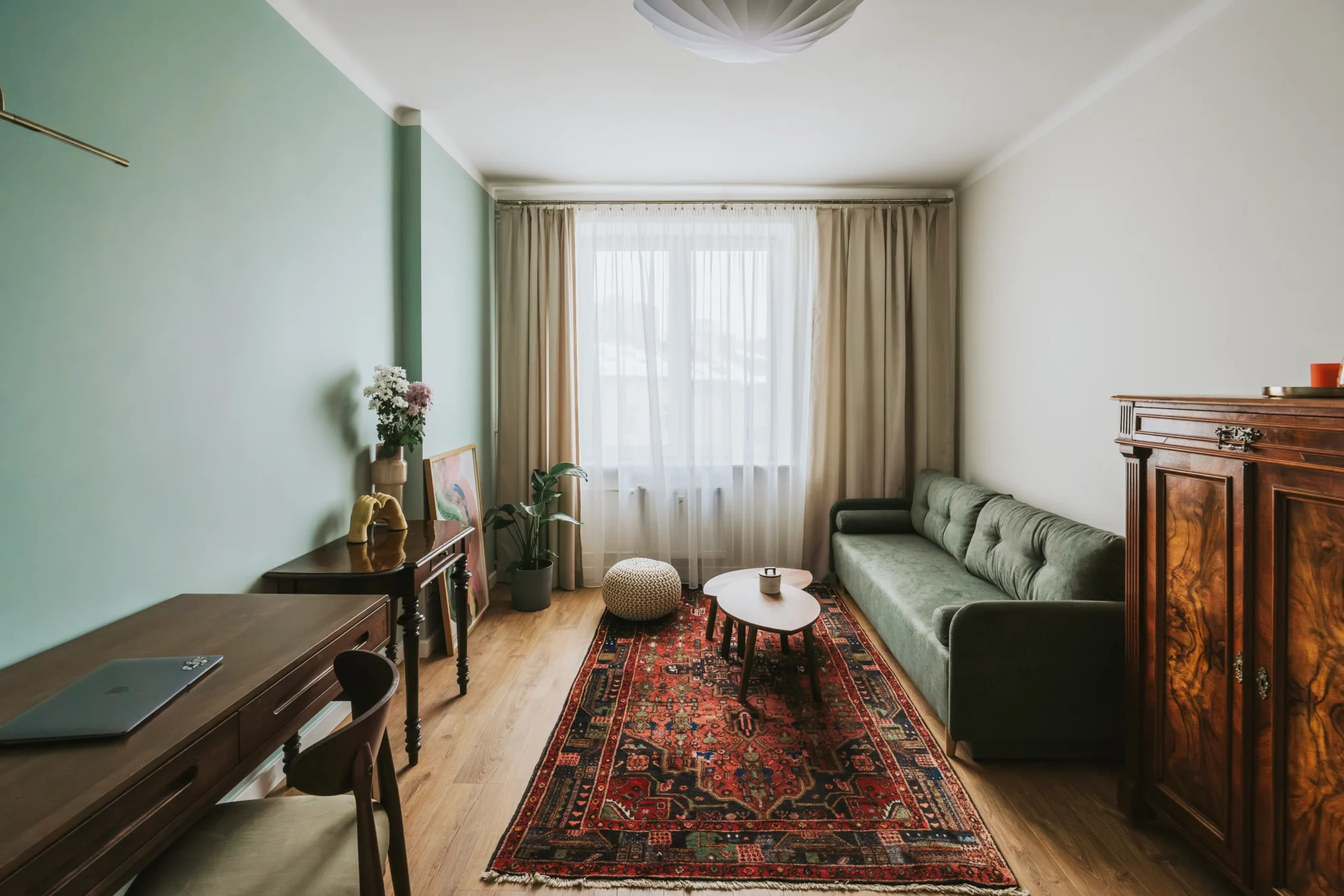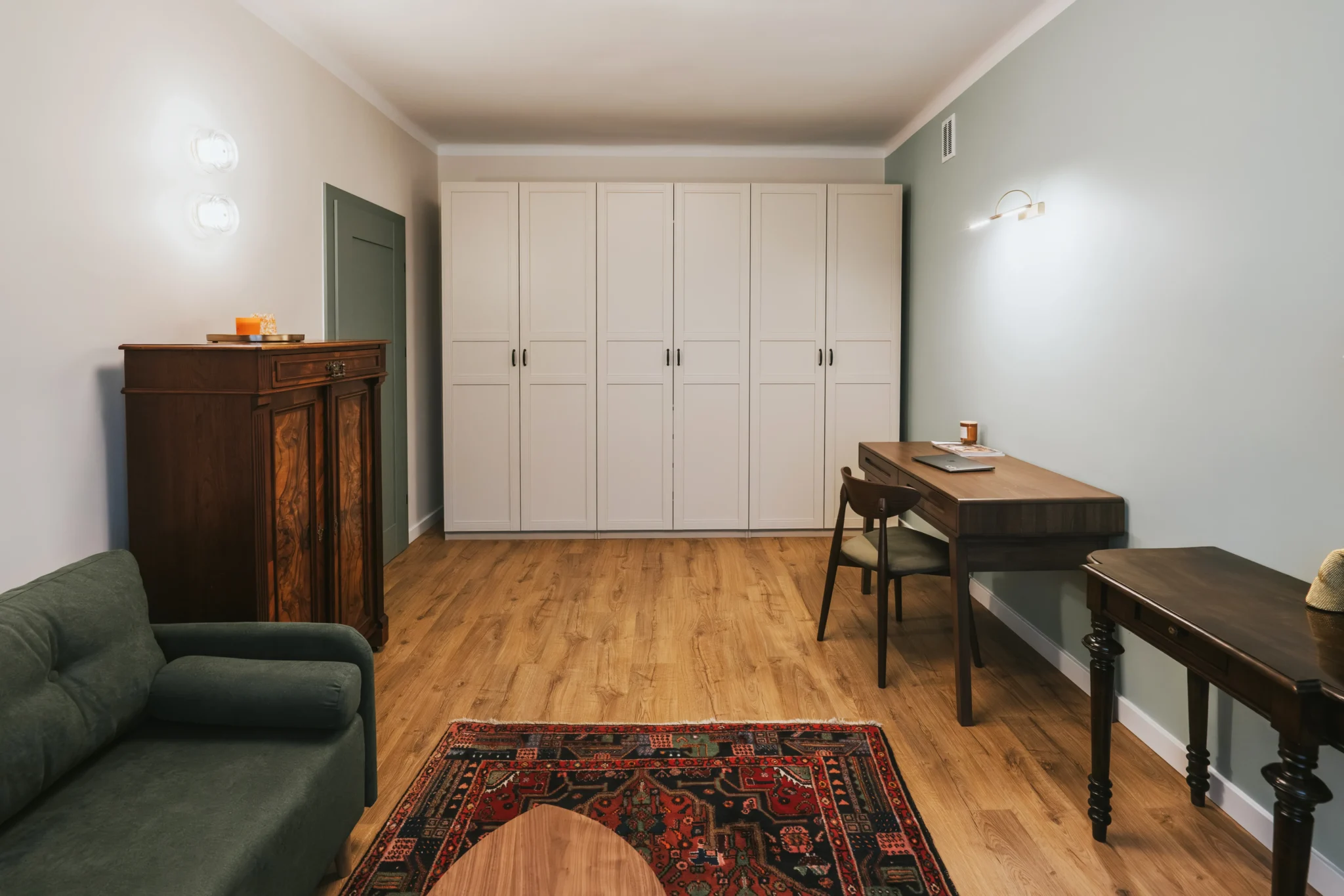 Pokój dzienny łączy różne funkcje: przechowywanie, wypoczynek, miejsce do nauki i spotkań z gośćmi. Dzięki przesunięciu drzwi (w ramach istniejącego układu) udało się wygospodarować miejsce na dużą zabudowę na ubrania i przedmioty codziennego użytku. Wnętrze uzupełnia eklektyczna mieszanka: zielona sofa z funkcją spania, wybrane antyczne meble i dywan w klimacie staro-nowoczesnym, które nadają całości wyjątkowego charakteru. To przestrzeń, która odpowiada realnym potrzebom i stylowi życia idealnie wpisując się w założenia projektu mieszkania stworzonego dla studenta.
