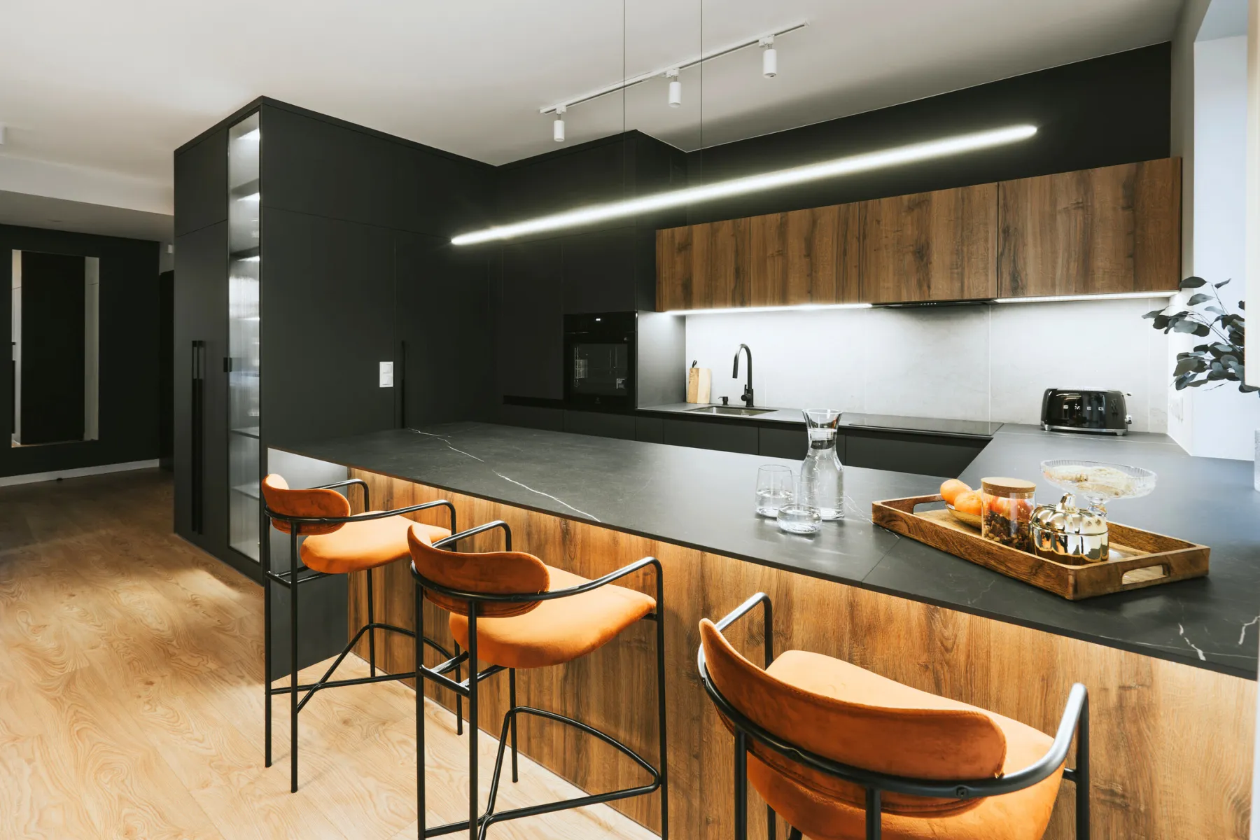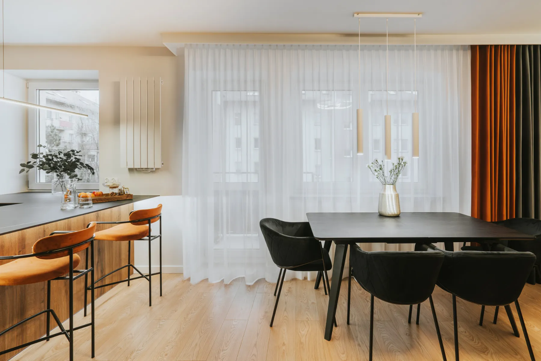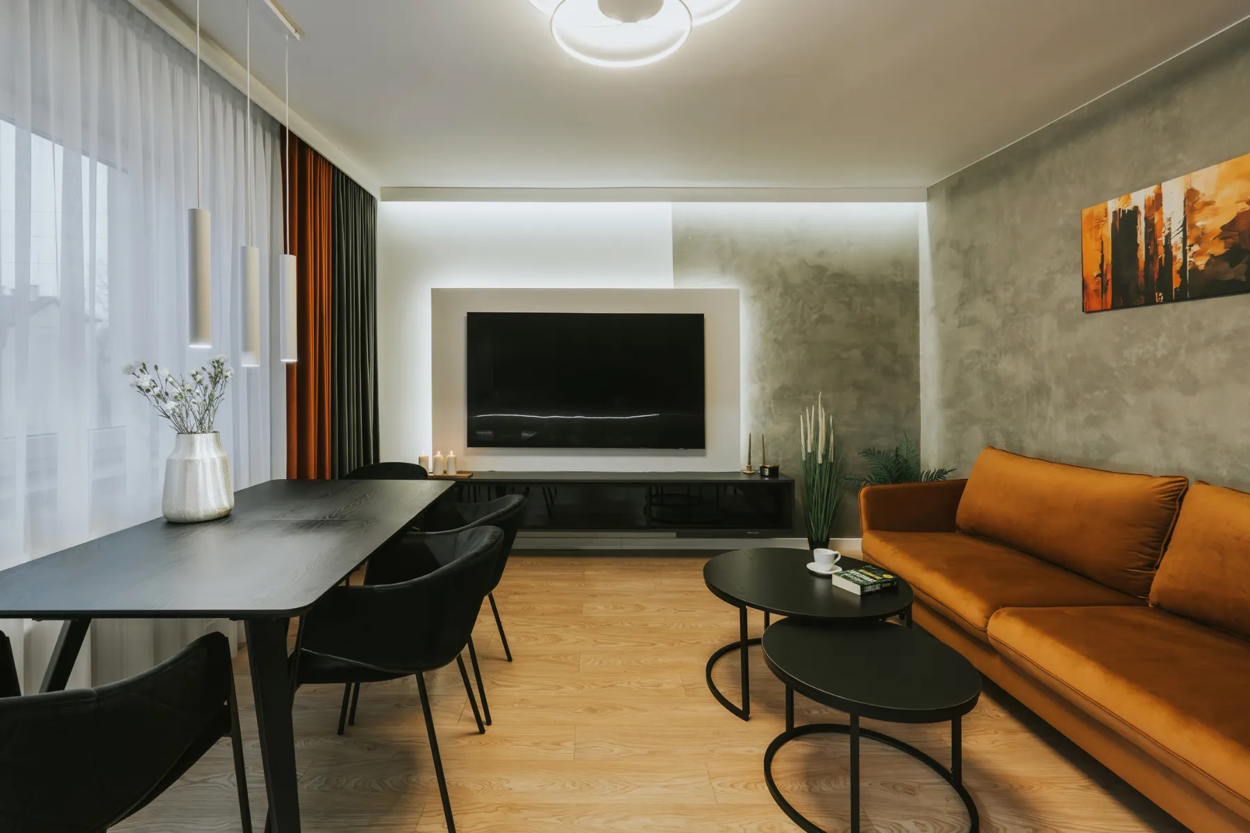 Kuchnia to połączenie nowoczesności i funkcjonalności. Oferuje bardzo dużo miejsca do przechowywania oraz spory blat roboczy ze spieku kwarcowego przechodzący w wyspę, która od strony salonu pełni również funkcję blatu przy którym można usiąść. W salonie główną rolę gra duża ścianka RTV z dekoracyjną zabudową GK oraz podświetleniem. Nowoczesny charakter podkreślają dodatki i meble w rdzawym kolorze (hokery i sofa) i jest to w zasadzie jedyny motyw kolorystyczny pojawiający się we wnętrzu. Wszystko w spójnej kolorystyce pasującej do całości mieszkania.
