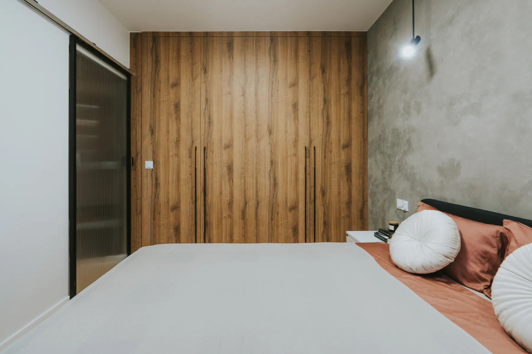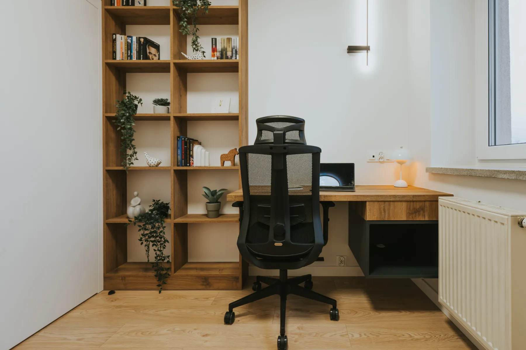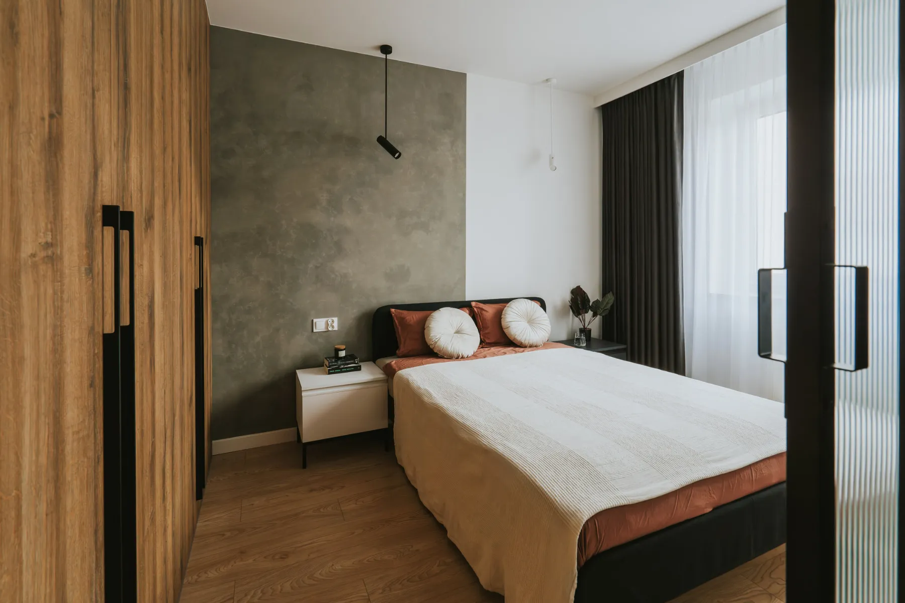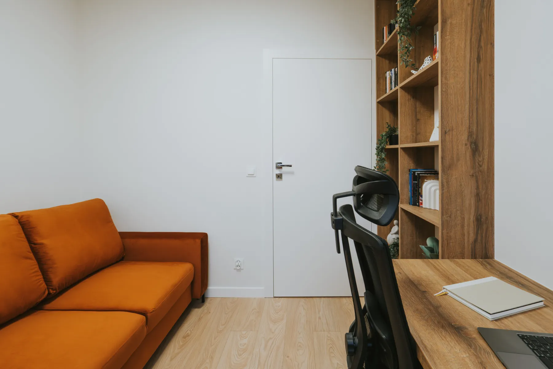 W sypialni zastosowaliśmy powtórzenie motywu tynku strukturalnego który kończy się na połowie łóżka. Całą ścianę po lewej stronie od wejścia zagospodarowaliśmy jako szafę wnękową, która pomieści wszystkie potrzebne rzeczy i ubrania. Sypialnię od przedpokoju dzielą loftowe, przesuwne, przeszklone drzwi aby jeszcze bardziej otworzyć przestrzeń i doświetlić przedpokój, który wcześniej nie miał dostępu do okna. Biuro to ostatnie pomieszczenie, które może równocześnie pełnić funkcję pokoju gościnnego, dzięki zastosowaniu rozkładanej sofy.