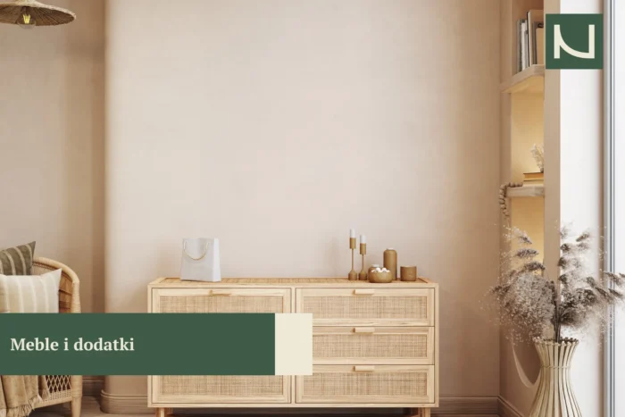 W przypadku mebli możemy zostać przy stonowanych kolorach urozmaiconych ciekawymi teksturami. Idealnym uzupełnieniem salonu będzie drewniana komoda z ryflowanymi frontami lub wiklinową plecionką.