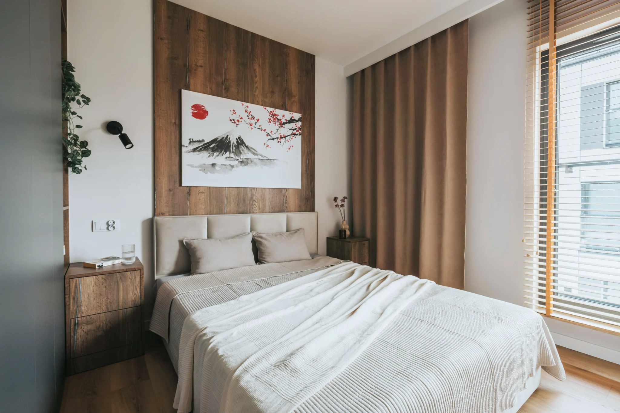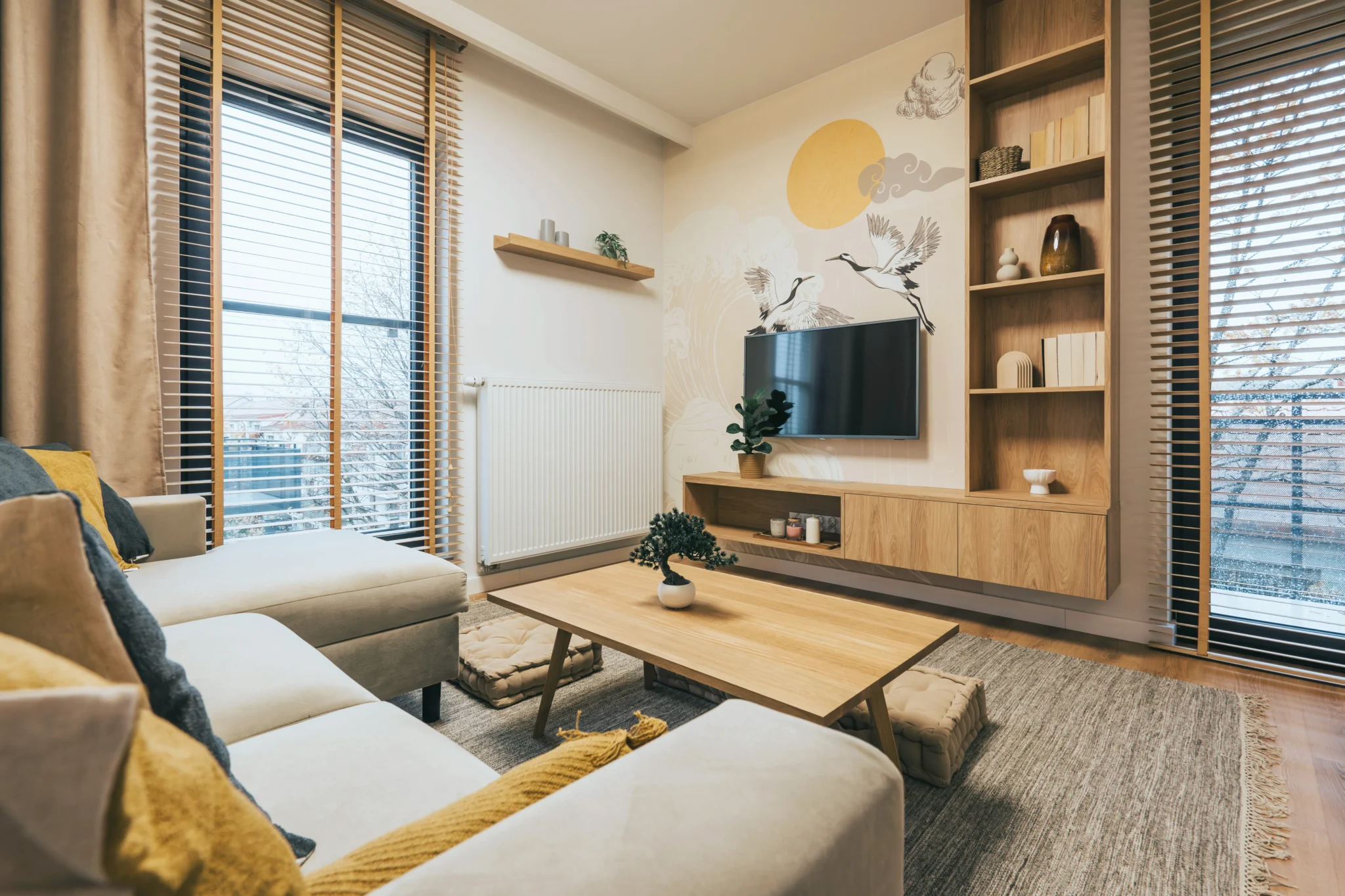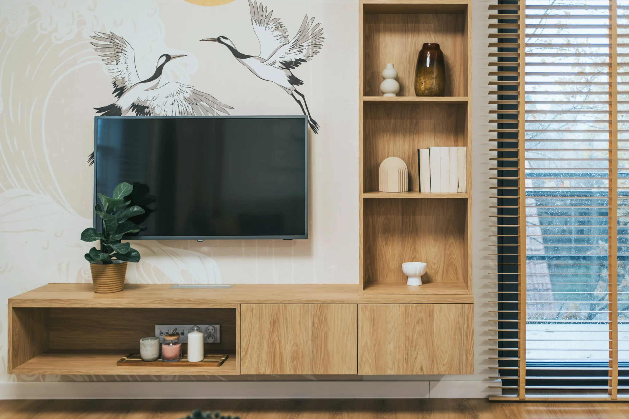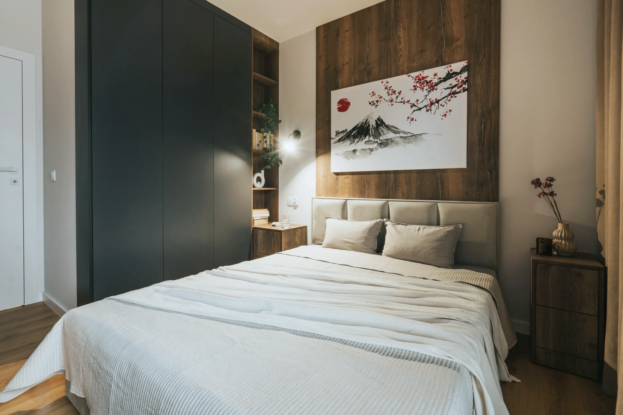 Salon zaprojektowaliśmy w stylu Japandi, z niskimi meblami i panelami ściennymi, które nawiązują do japońskich inspiracji. Kolorystyka wnętrza opiera się na beżach i odcieniach drewna, z dodatkami w postaci tapety „Japanese Crane”. Łazienka została zaplanowana z myślą o funkcjonalności – wanna z hydromasażem z osobnym obwodem elektrycznym oraz spójna podłoga, która łączy łazienkę z resztą mieszkania.