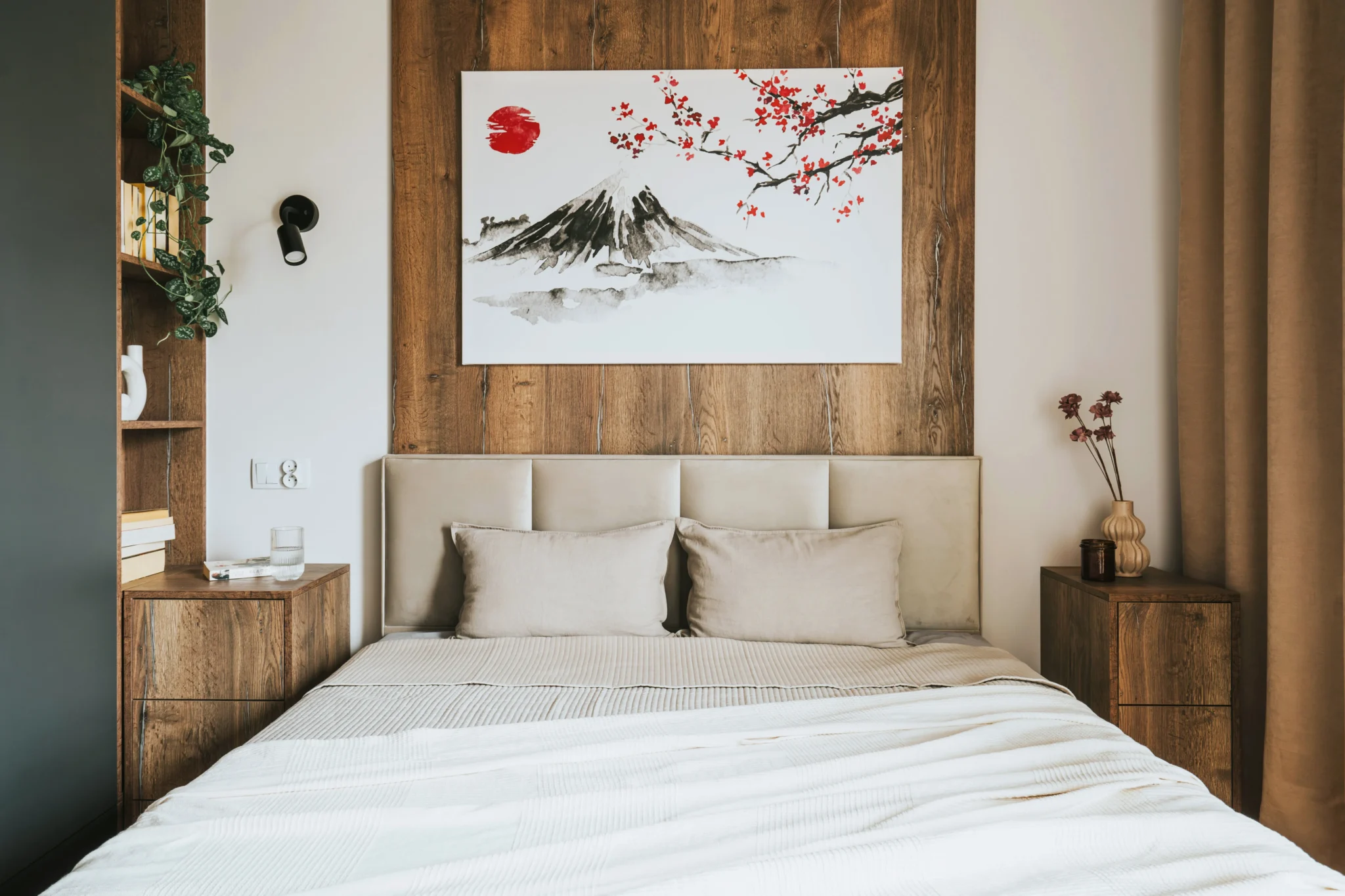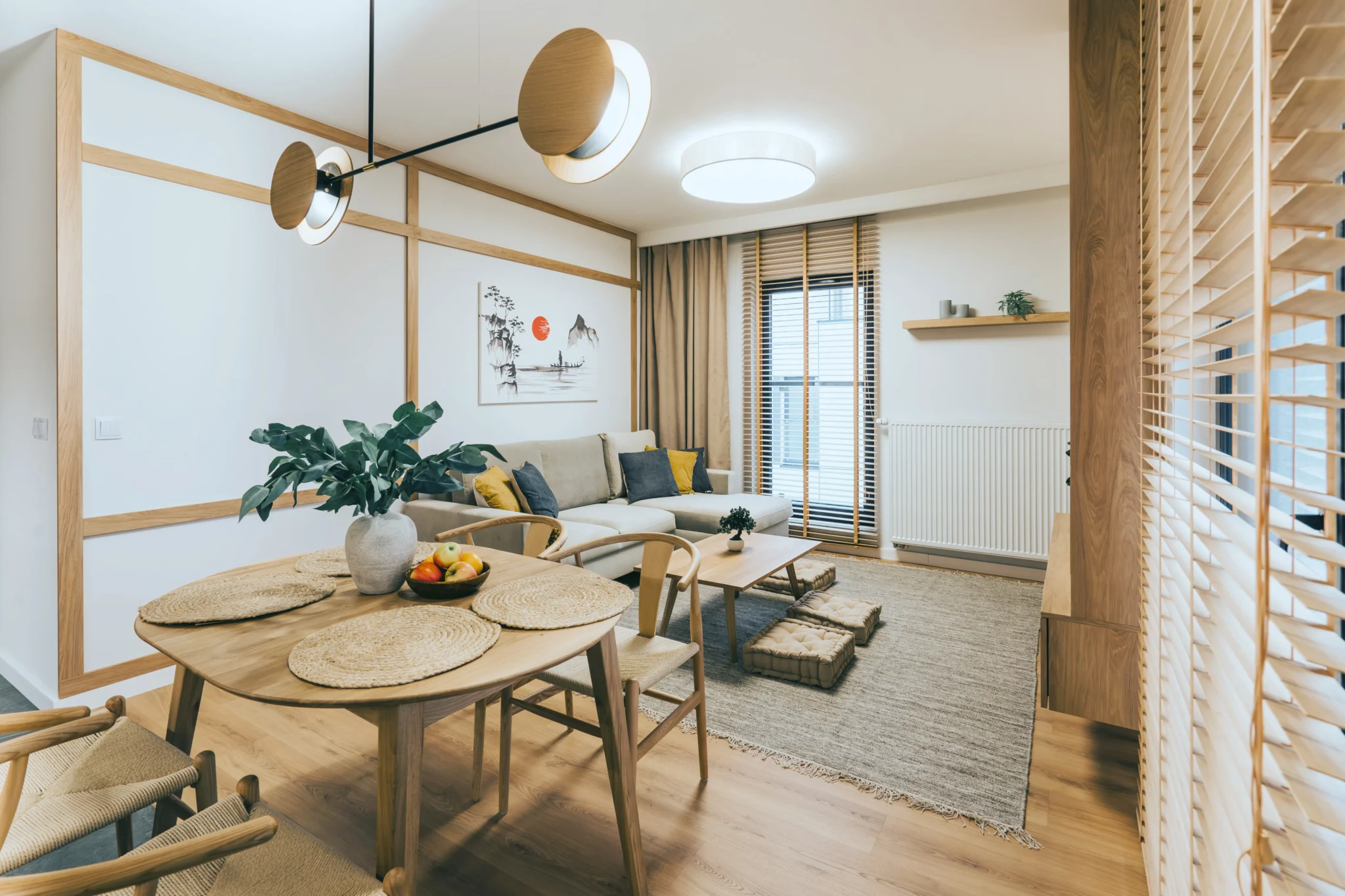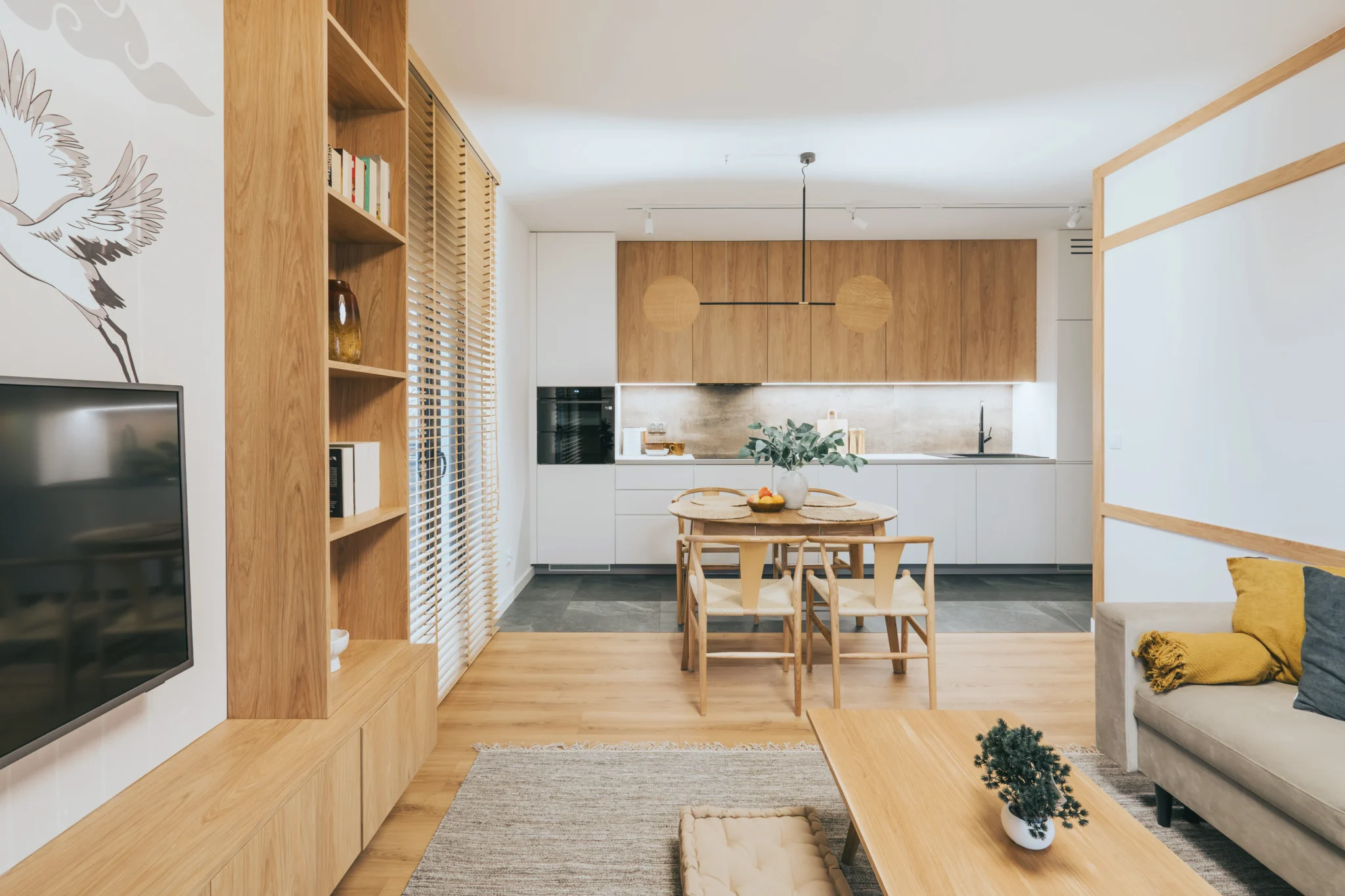 Salon zaprojektowaliśmy w stylu Japandi, z niskimi meblami i panelami ściennymi, które nawiązują do japońskich inspiracji. Kolorystyka wnętrza opiera się na beżach i odcieniach drewna, z dodatkami w postaci tapety „Japanese Crane”. Łazienka została zaplanowana z myślą o funkcjonalności – wanna z hydromasażem z osobnym obwodem elektrycznym oraz spójna podłoga, która łączy łazienkę z resztą mieszkania.