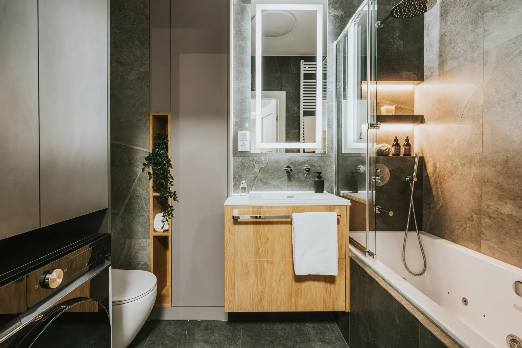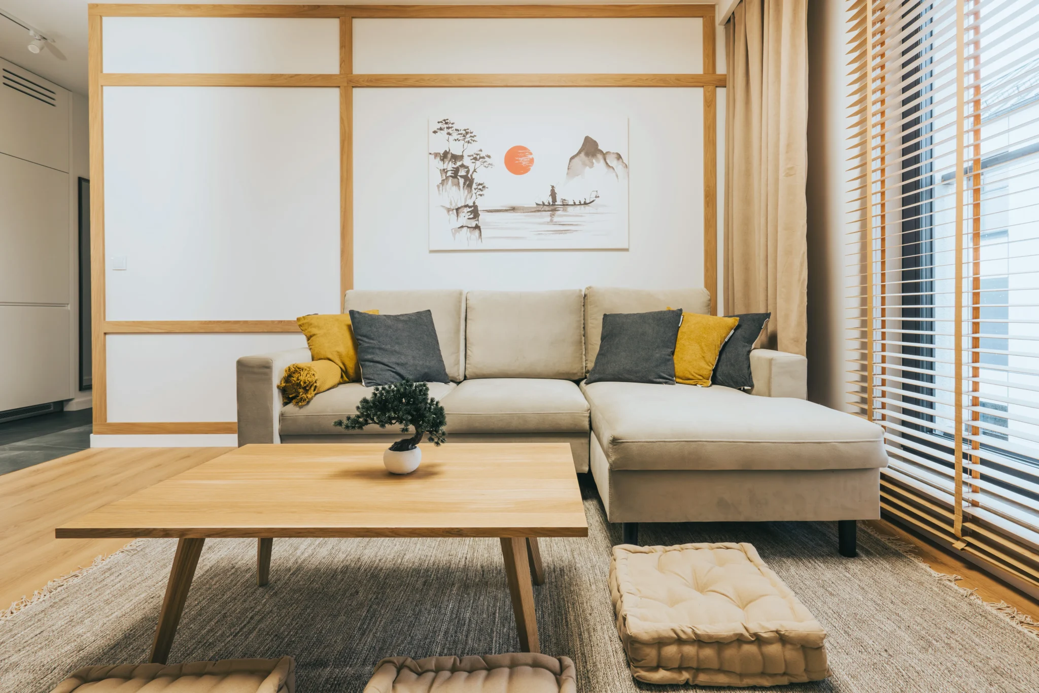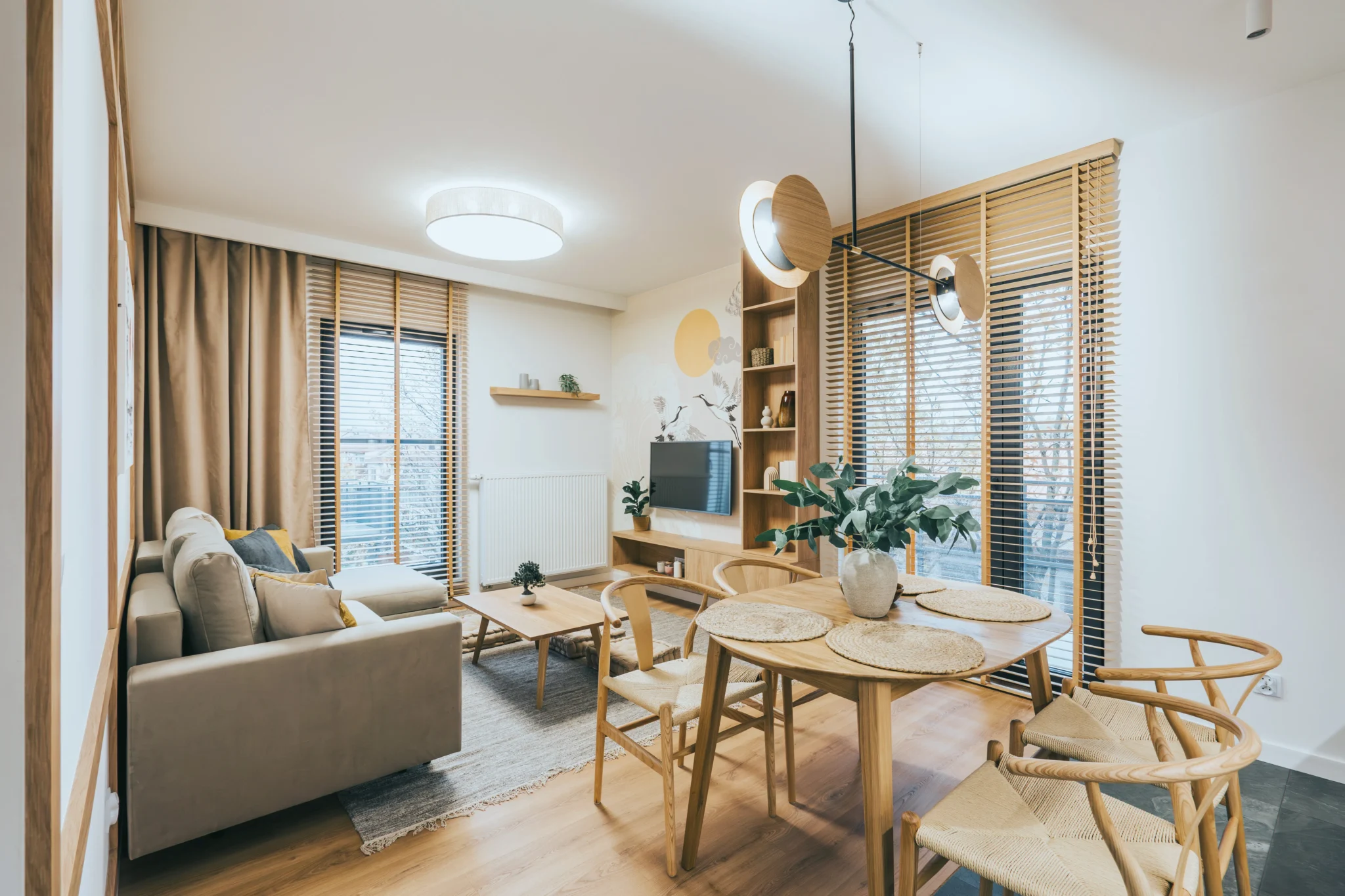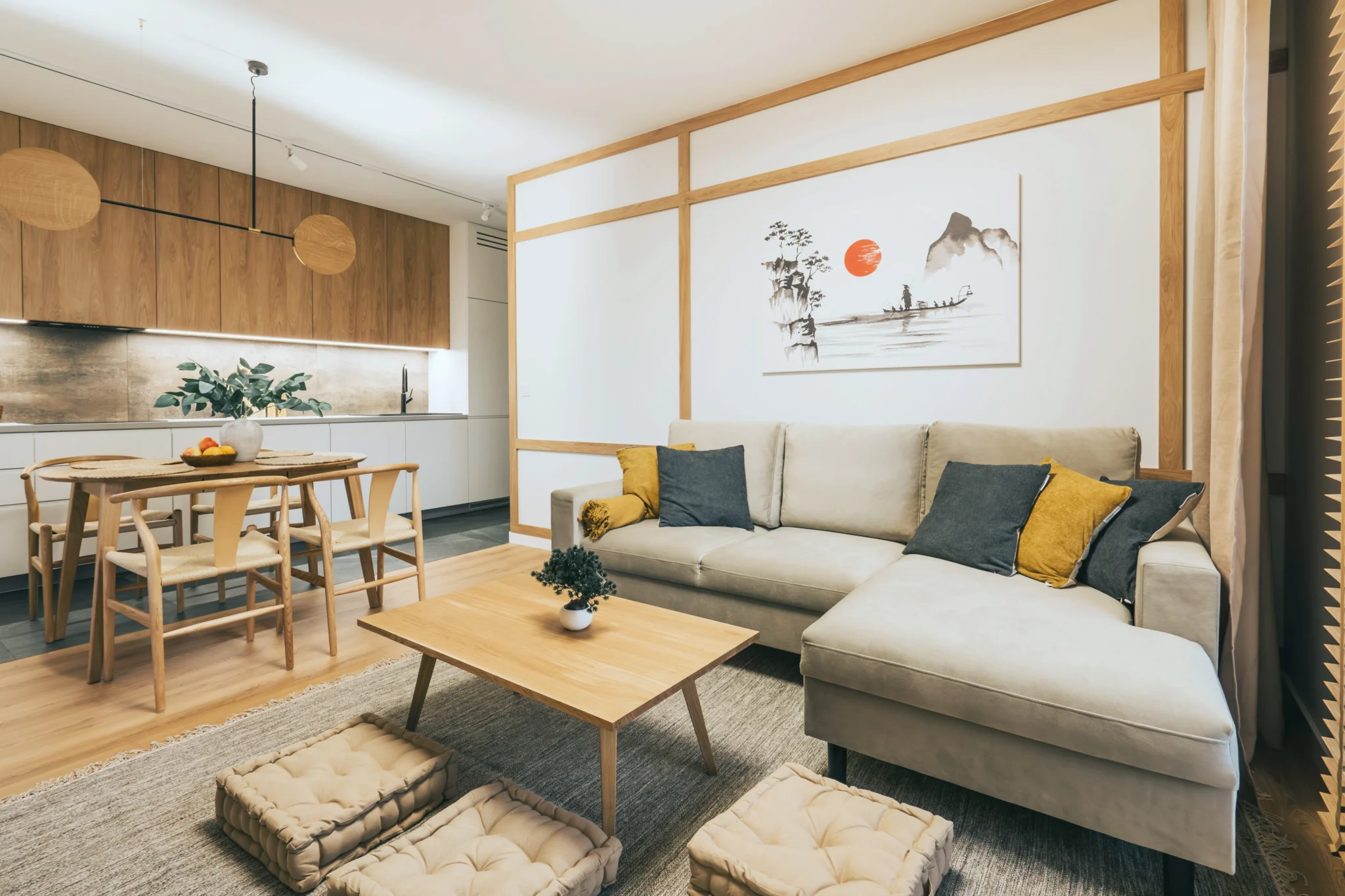 Salon zaprojektowaliśmy w stylu Japandi, z niskimi meblami i panelami ściennymi, które nawiązują do japońskich inspiracji. Kolorystyka wnętrza opiera się na beżach i odcieniach drewna, z dodatkami w postaci tapety „Japanese Crane”. Łazienka została zaplanowana z myślą o funkcjonalności – wanna z hydromasażem z osobnym obwodem elektrycznym oraz spójna podłoga, która łączy łazienkę z resztą mieszkania.