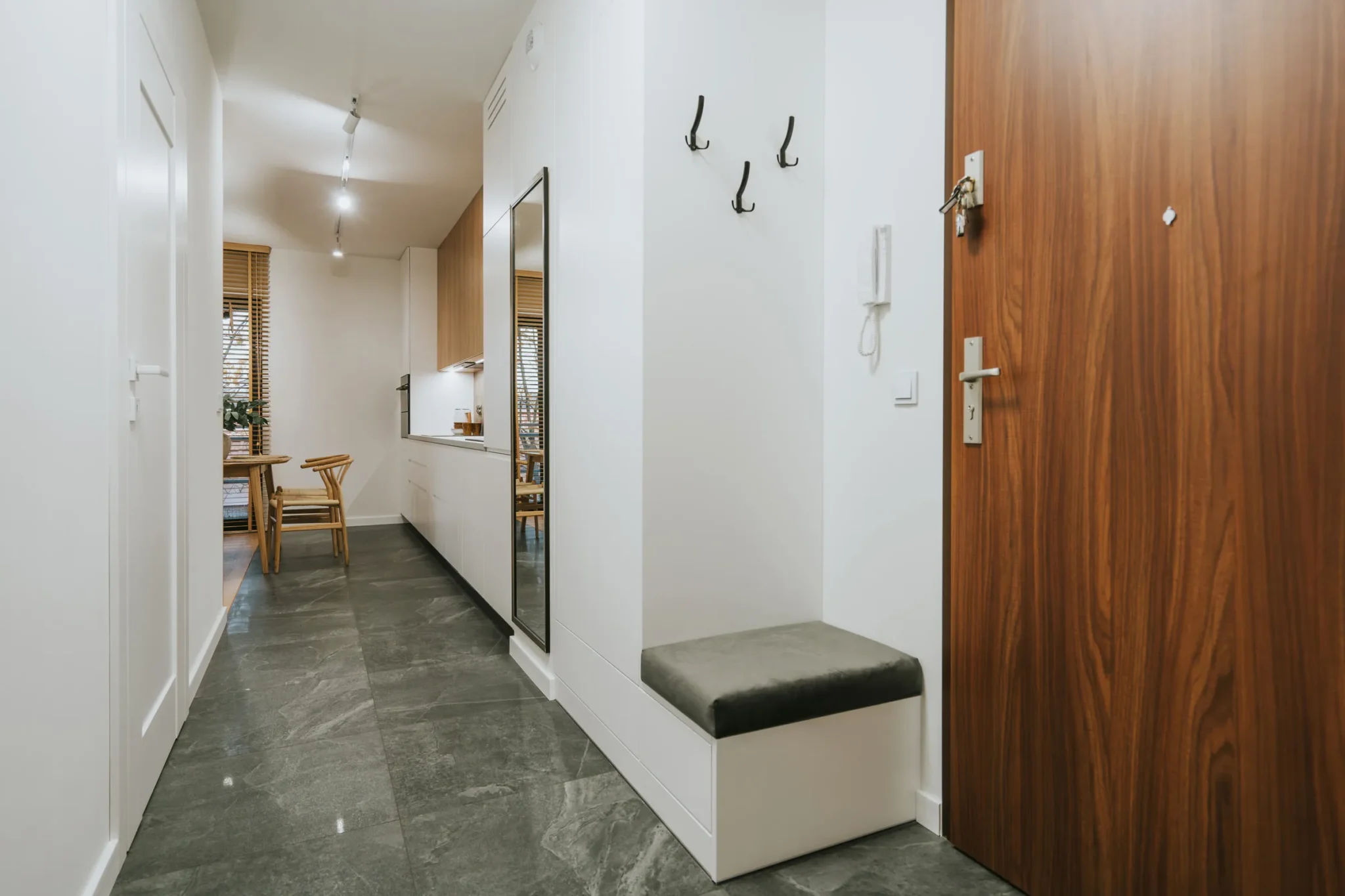 Mieszkanie składa się z dwóch pokoi, salonu z aneksem kuchennym, przedpokoju oraz łazienki. Wyzwaniem projektowym było zmieszczenie wszystkich tych elementów w tak ograniczonej przestrzeni. Początkowo rozważaliśmy połączenie strefy SPA w łazience, ale po analizie okazało się to niemożliwe ze względu na istniejący układ ścian. Zdecydowaliśmy się więc na saunę wolnostojącą, która wymaga jedynie okna i dostępu do prądu, co pozwoliło zaoszczędzić miejsce.