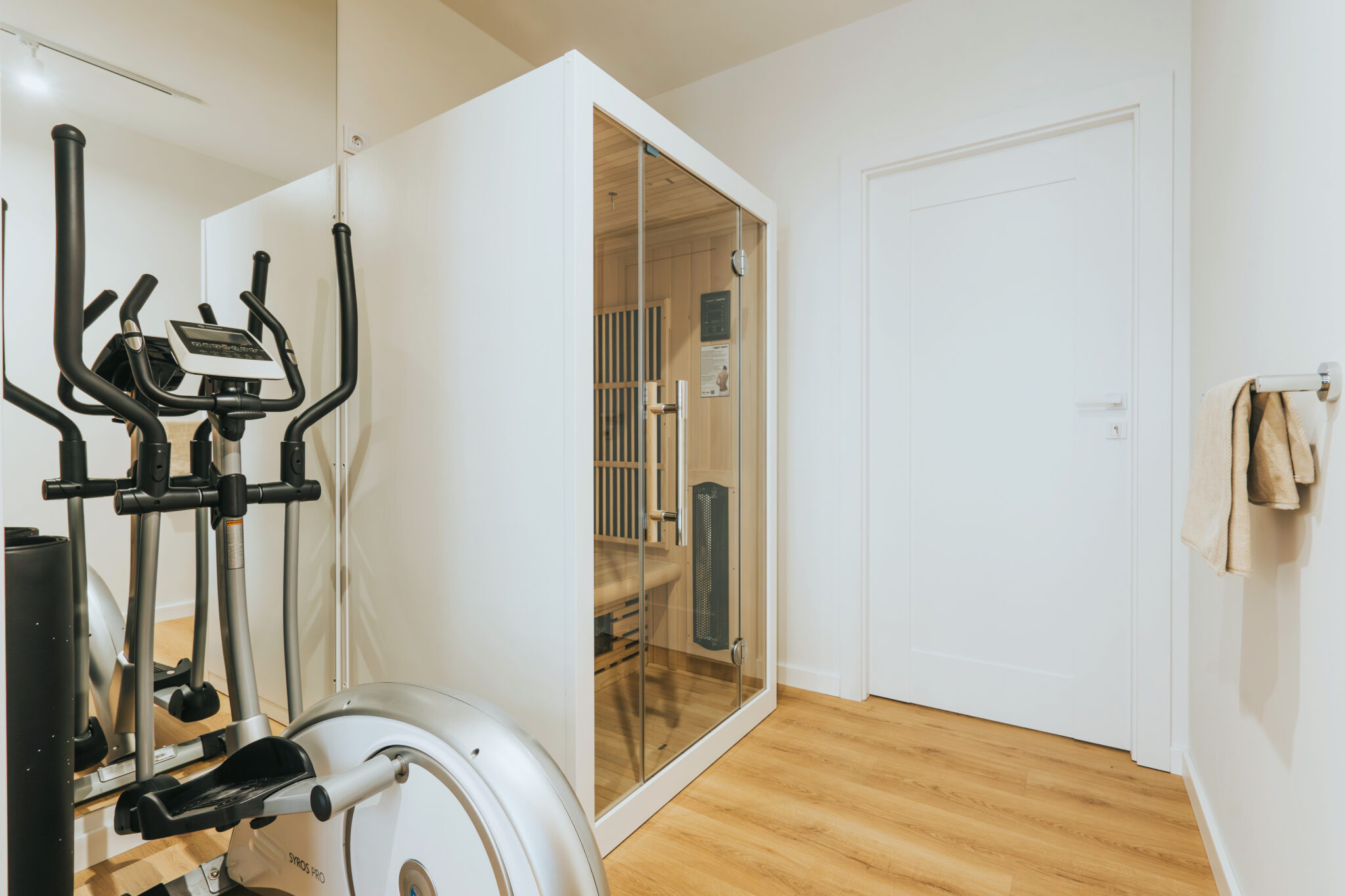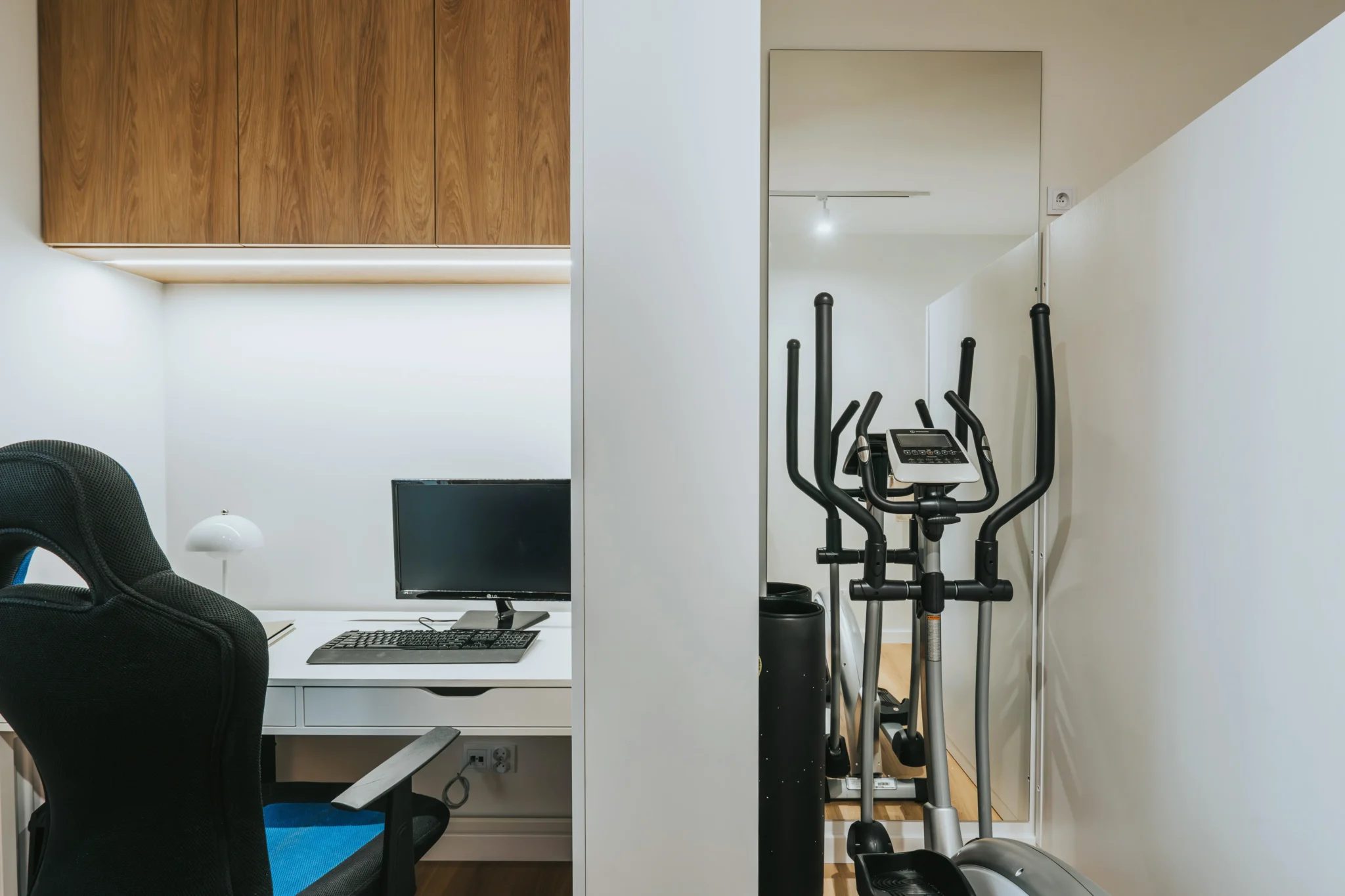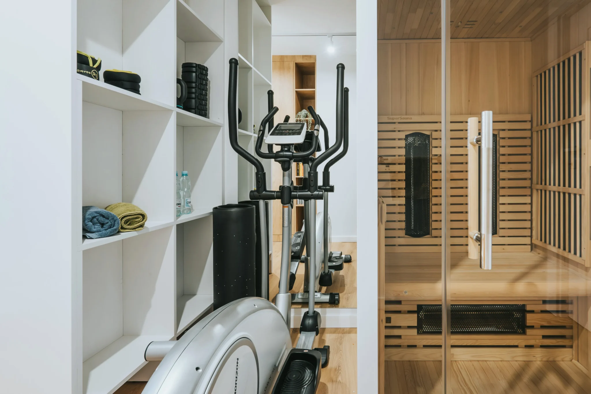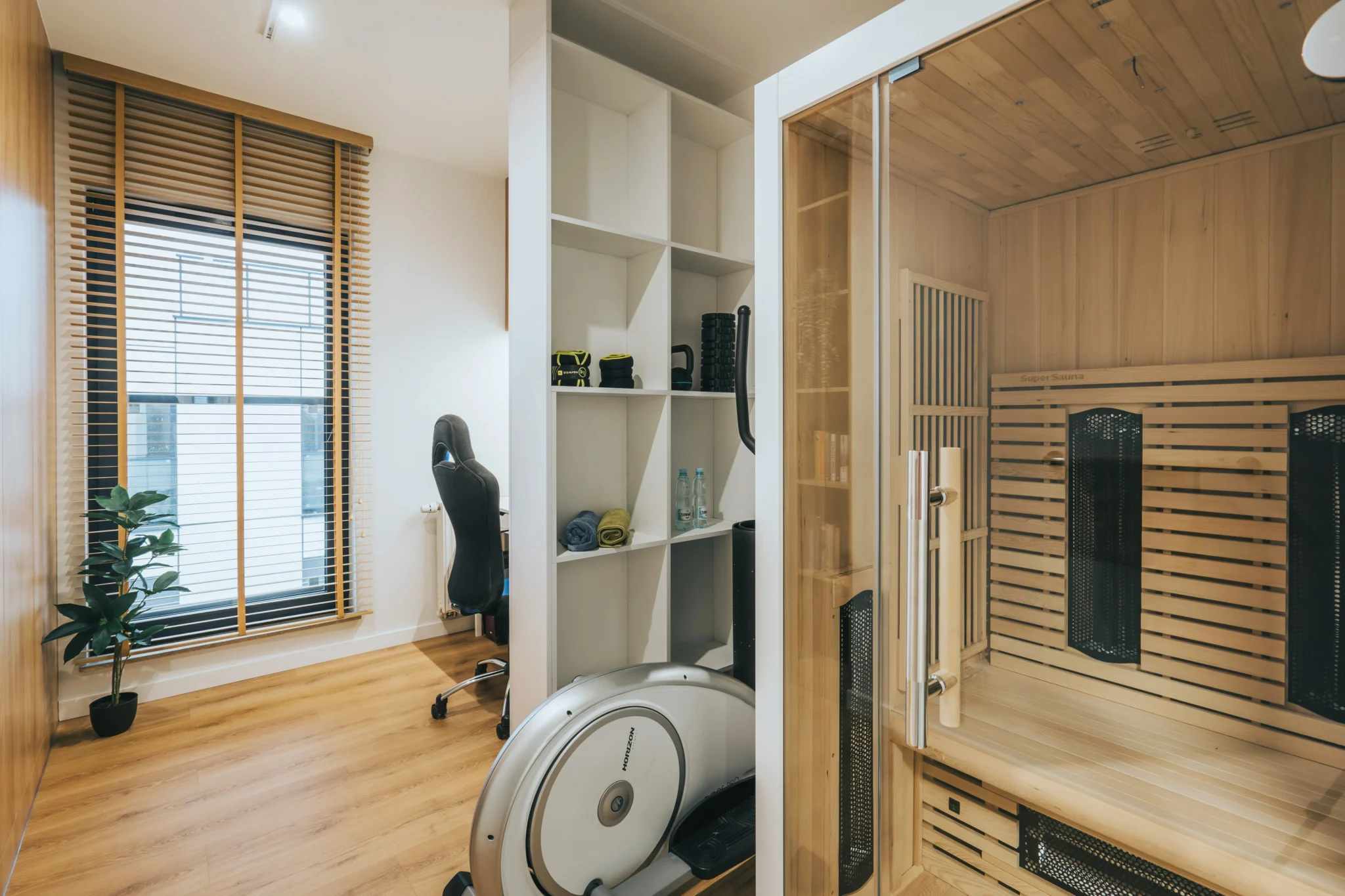 Sauna znalazła swoje miejsce w drugim pokoju, który pierwotnie miał pełnić funkcję mini siłowni i biura. Udało się tam zmieścić wszystkie zaplanowane elementy: saunę, orbitrek, regał na sprzęt i część biurową. Dzięki zabudowie wnękowej w pełni wykorzystaliśmy przestrzeń dostępną w mieszkaniu.